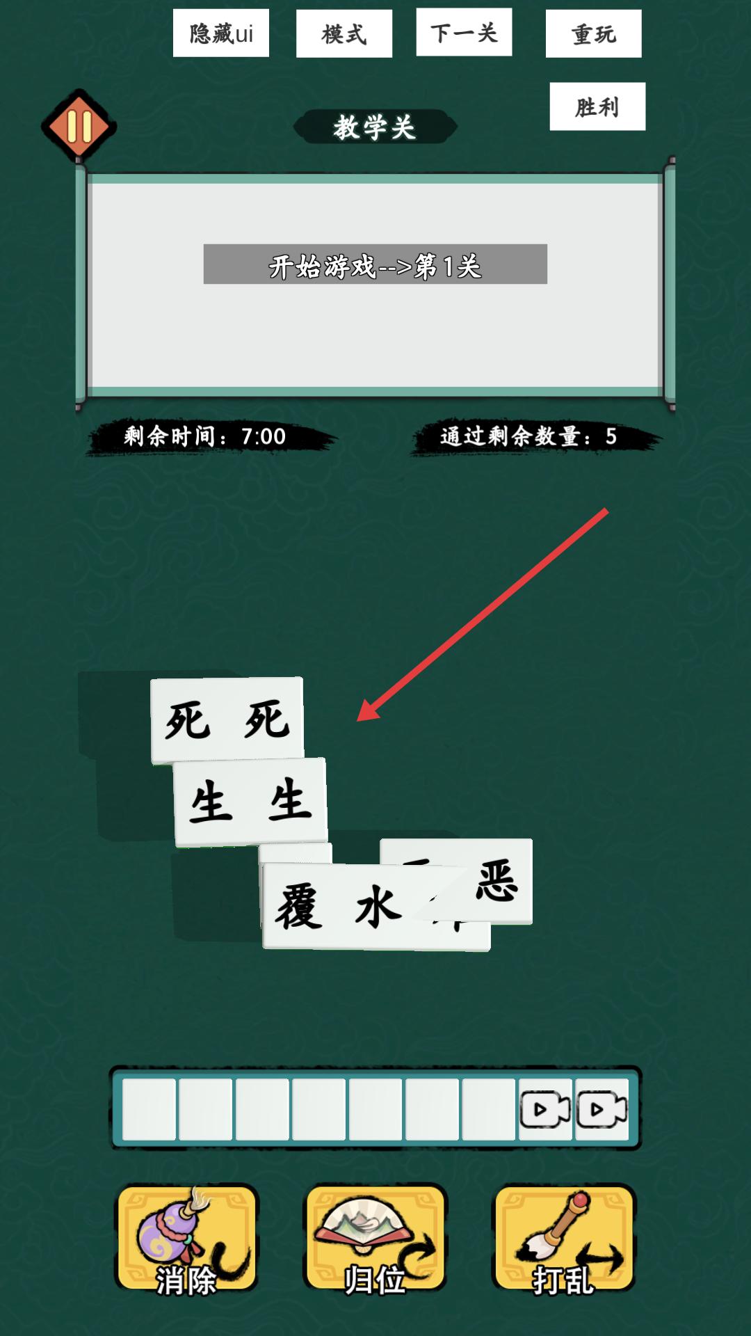 1、进入教学关,观察散落的汉字方块,找到相同或能组成成语的字,如死死生生配对点击消除。