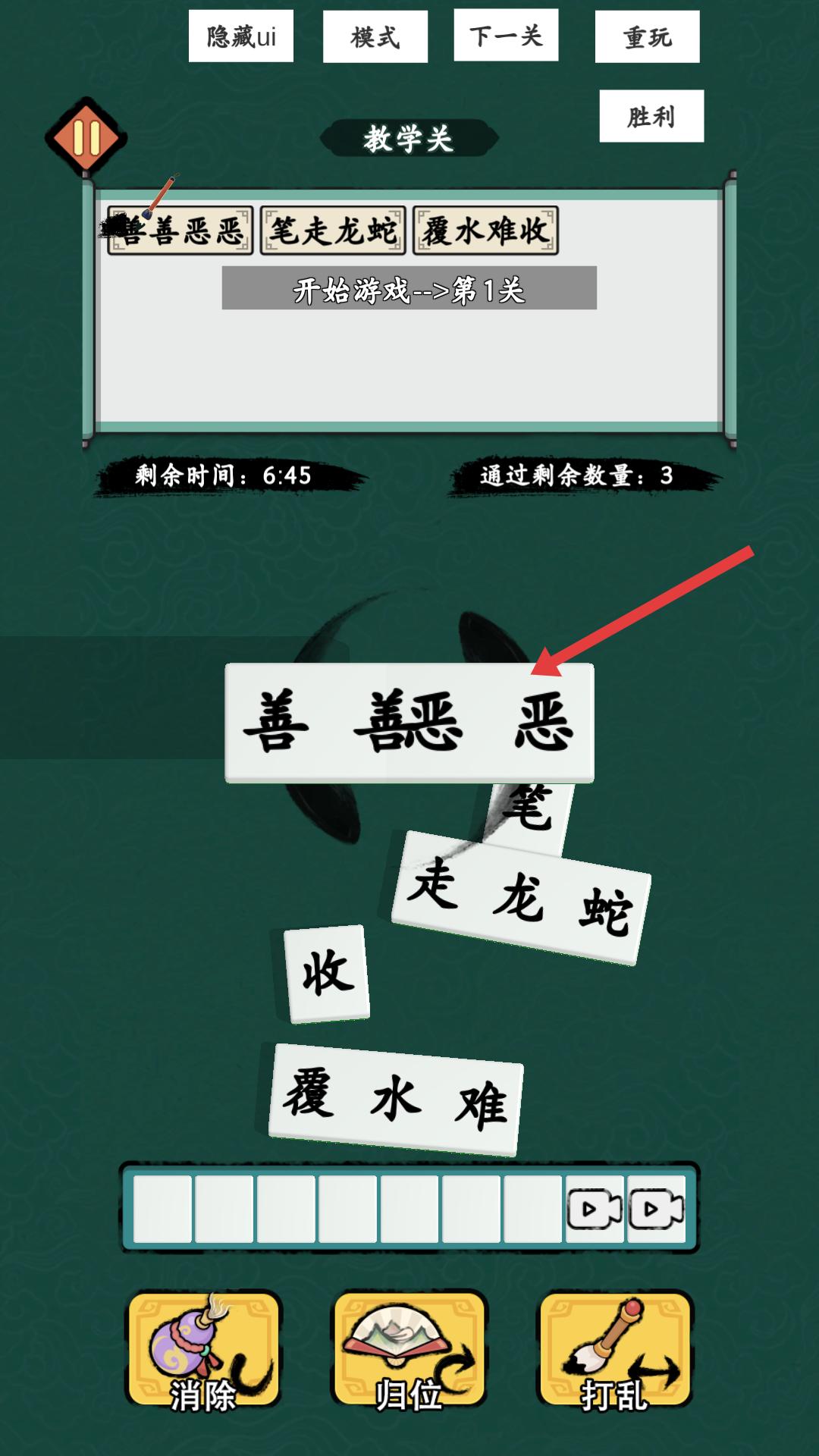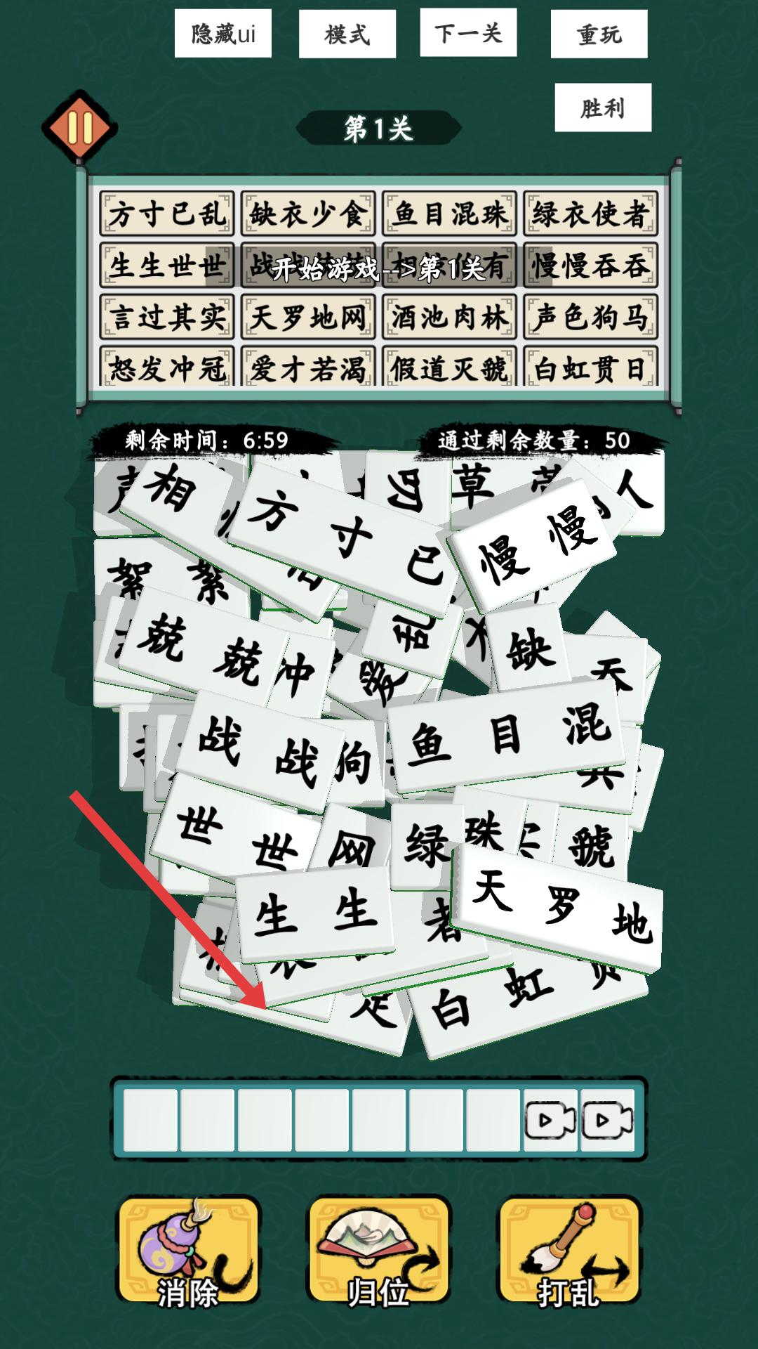 3、后续关卡利用消除、归位、打乱道具,辅助整理汉字,快速找到可配对或组成成语的字,达成通关数量要求。