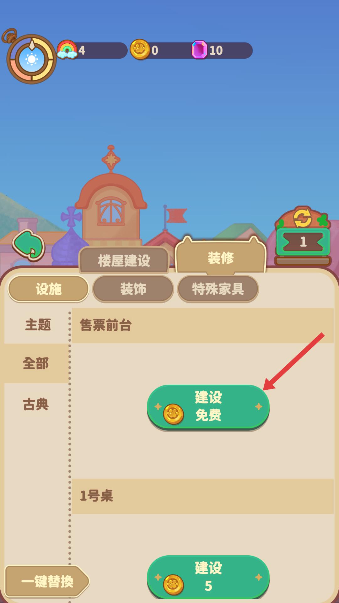 2、进入楼屋建设界面后,在设施列表中找到售票前台选项,点击其对应的建设免费按钮,即可免费建设售票前台,完善建筑设施。
