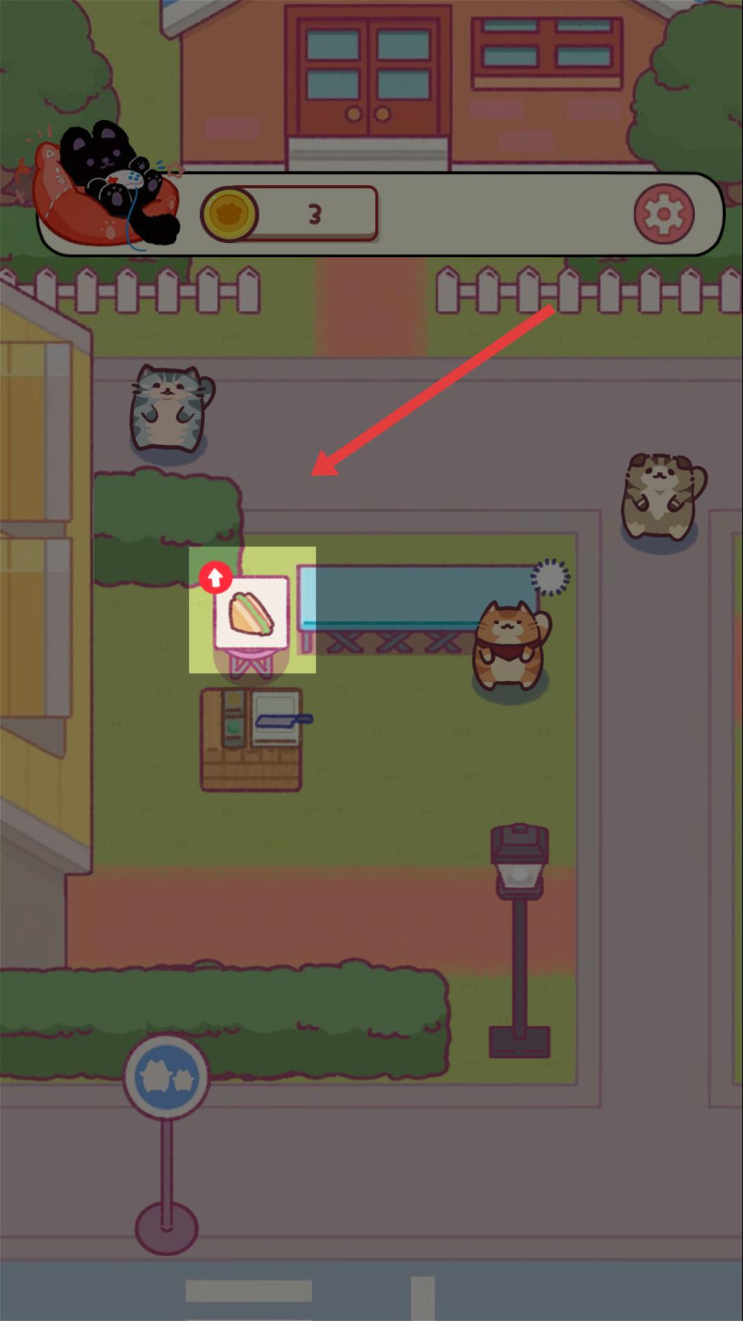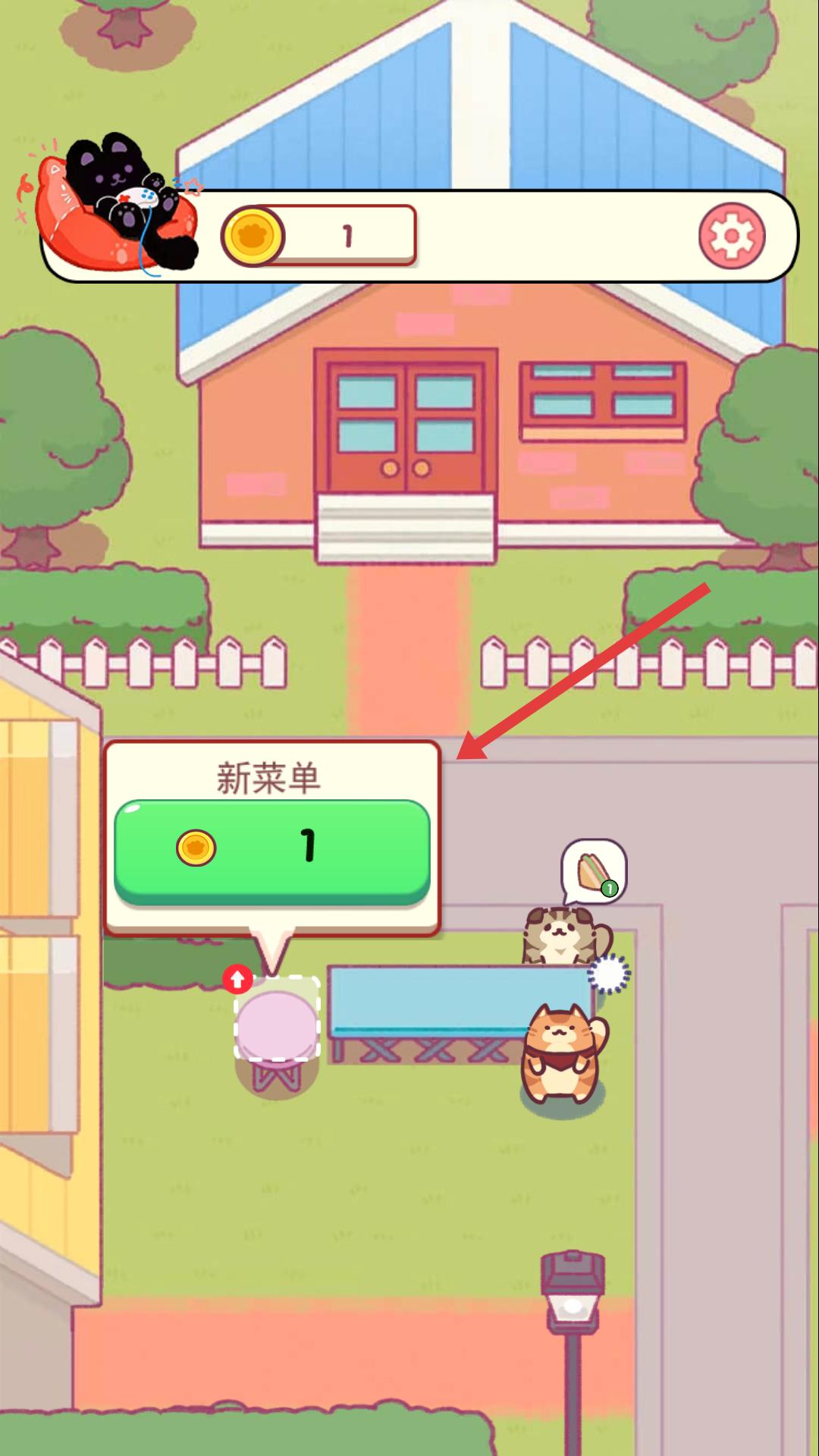 1、进入游戏后留意带有红色箭头标识的建筑或设施,点击进入可查看相关功能,如通过新菜单建筑可解锁新菜品,满足猫咪顾客的不同需求。