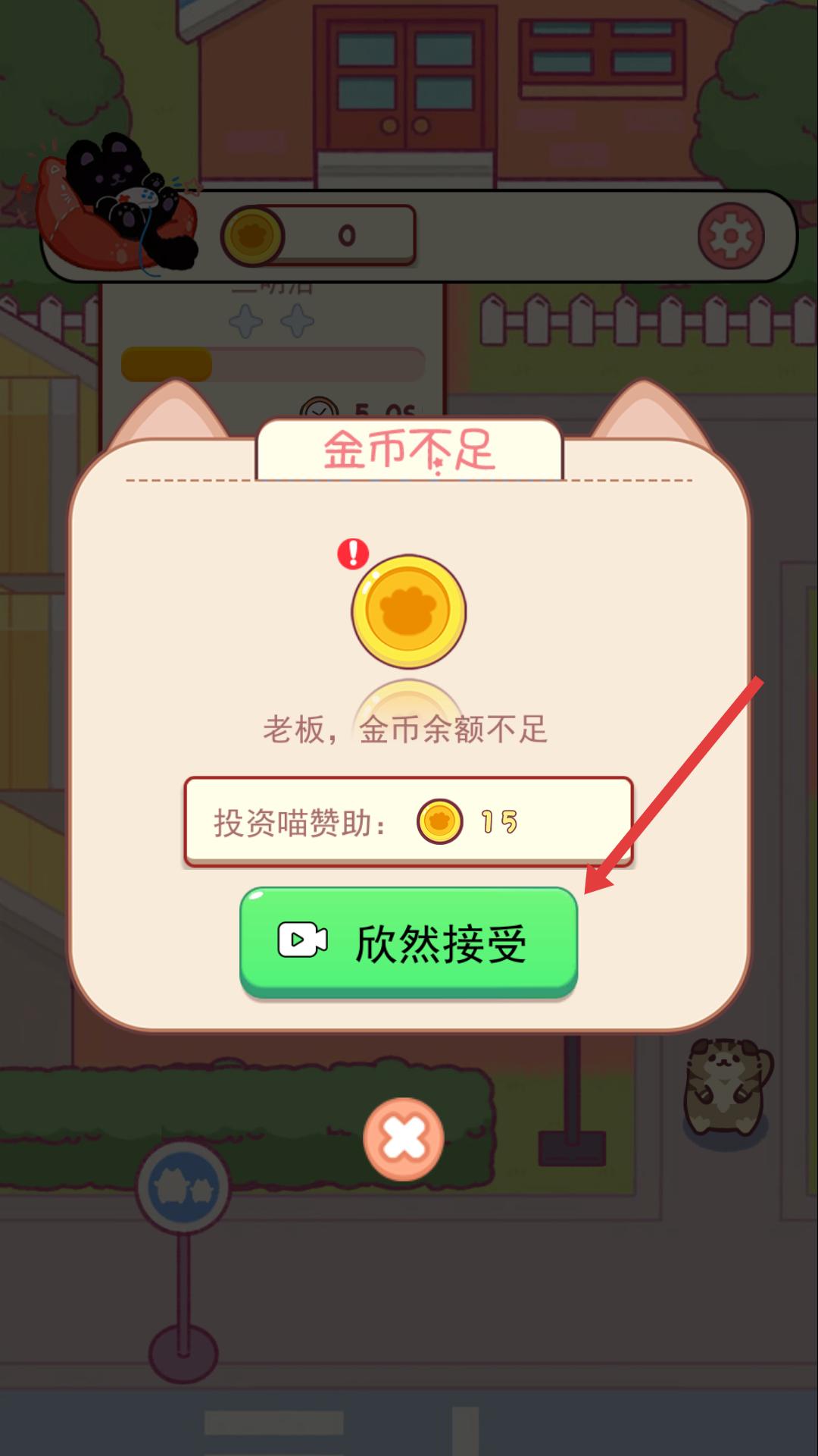 3、当进行操作时出现金币不足提示,若想继续推进可点击欣然接受按钮,观看广告获得投资喵赞助的金币,以便完成后续操作。