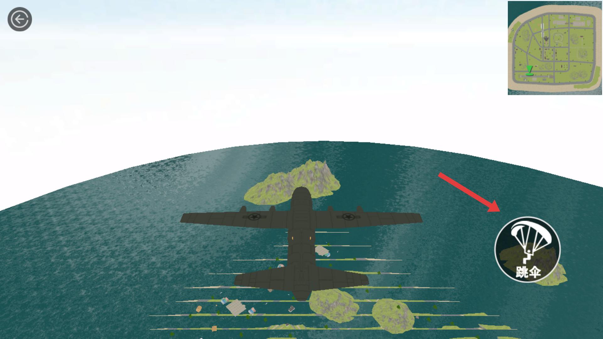 2、准备就绪后,角色会在飞机上,等待飞机飞到合适区域,点击跳伞按钮,从飞机上跳下。
