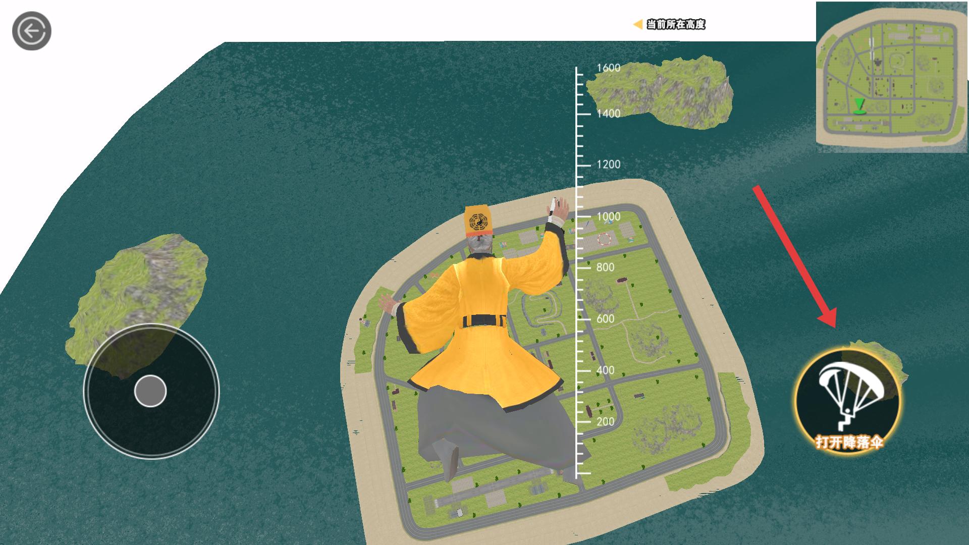 3、跳下后在空中调整方向,选择想要降落的地点,当高度合适时,点击打开降落伞按钮,平稳降落。