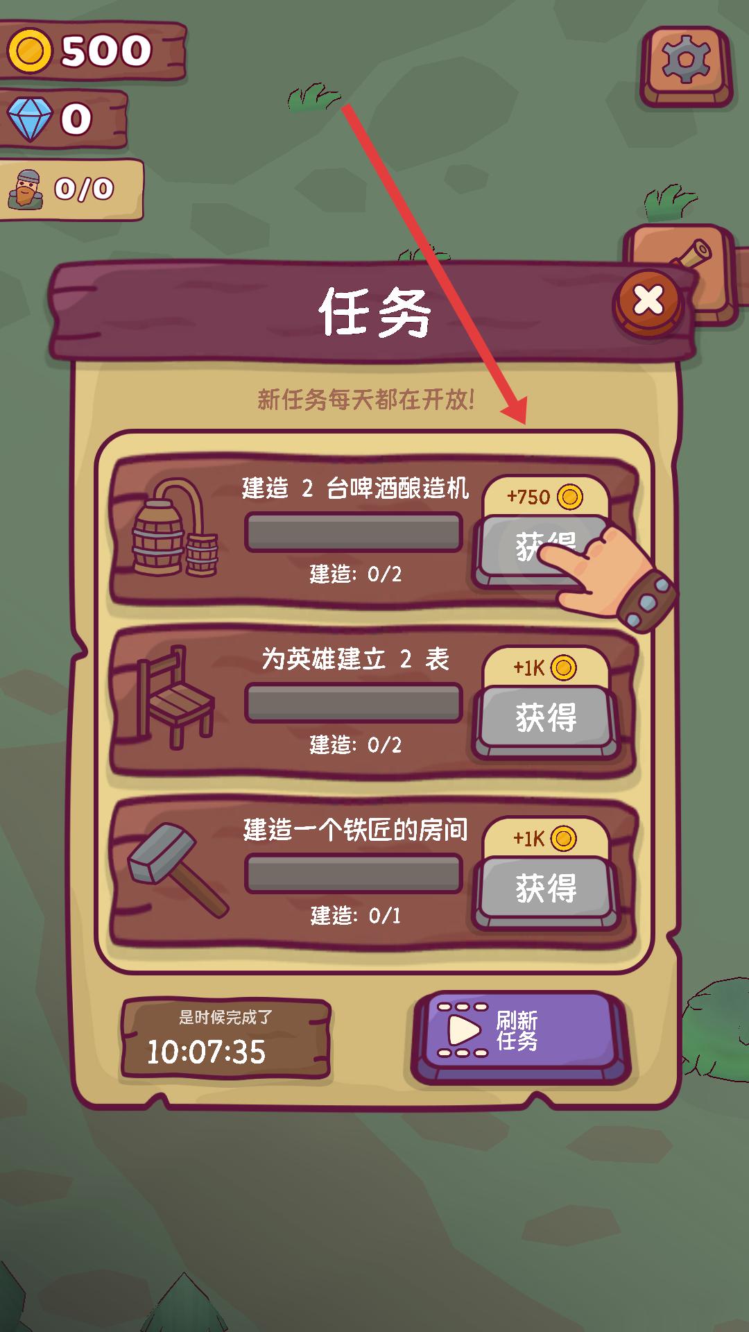4、击败指定数量的蘑菇后,回到任务界面,可领取相应的金币奖励,同时还能查看新的任务,如建造啤酒酿造机等,继续推进游戏。