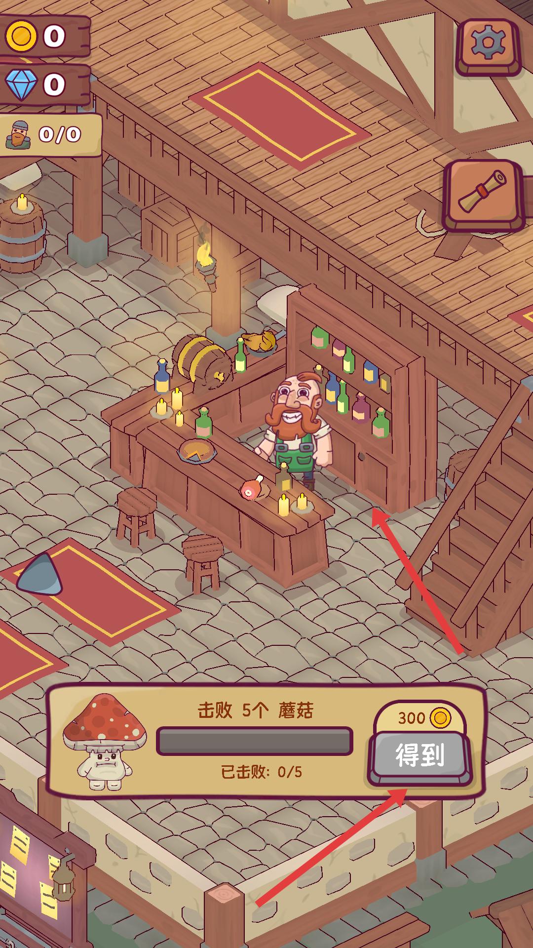 1、进入游戏,在酒馆场景中,可看到击败蘑菇的任务提示,点击相关按钮,接取击败5个蘑菇的任务,开启战斗之旅。