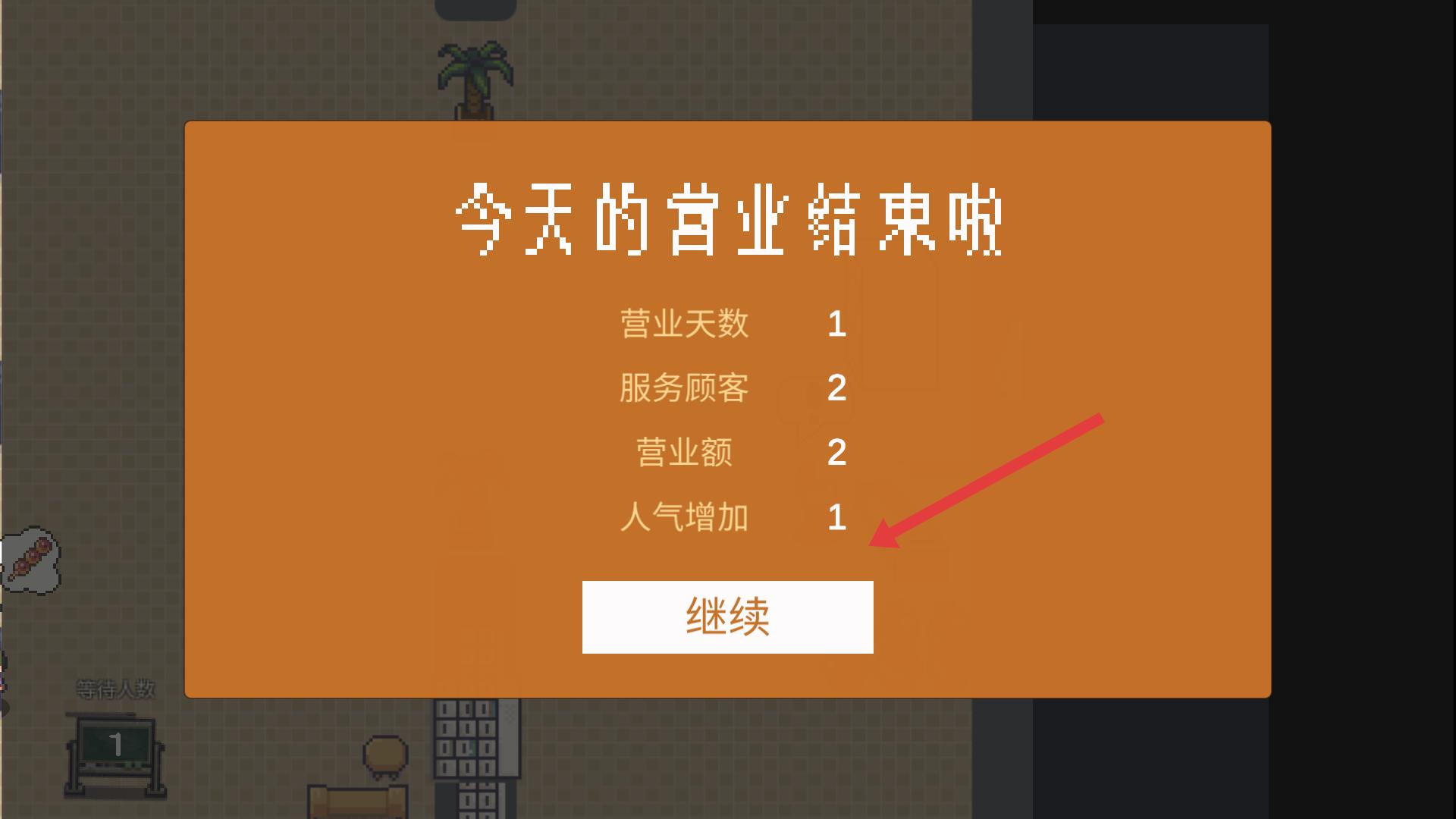 4、一天营业结束后,会显示营业天数、服务顾客数、营业额和人气增加等信息,点击继续按钮,开启下一天的营业。