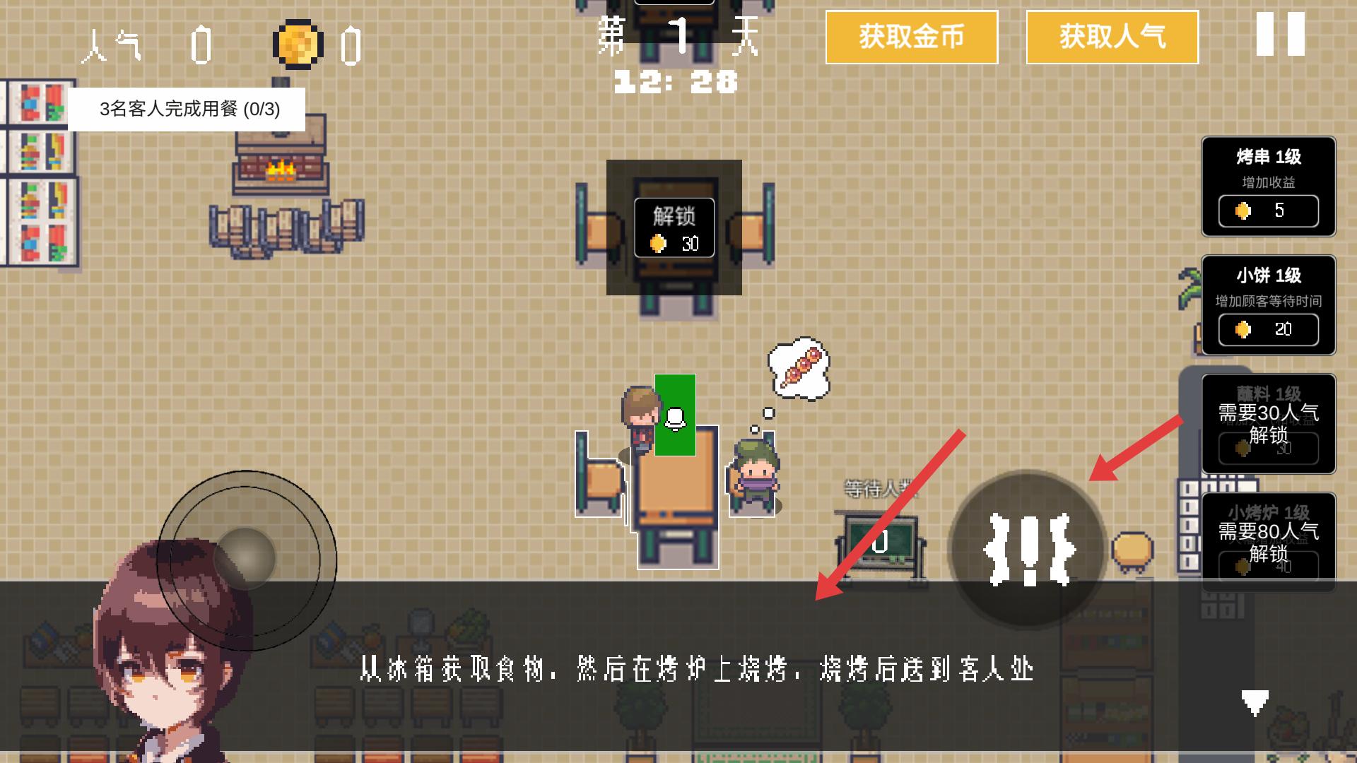 1、进入游戏后,从冰箱获取食材,然后将食材放到烤炉上进行烧烤,烧烤完成后,把食物送到客人座位处,满足客人用餐需求。