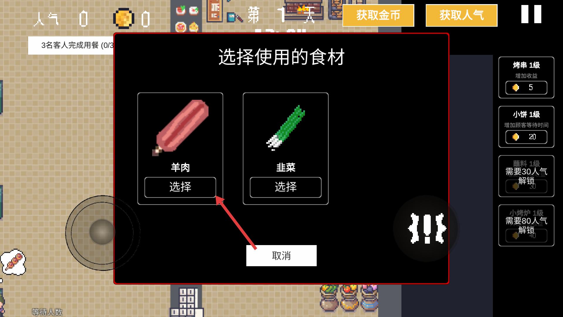 2、当客人有用餐需求时,根据提示选择合适的食材,比如羊肉、韭菜等,为客人准备对应的烤串等食物。