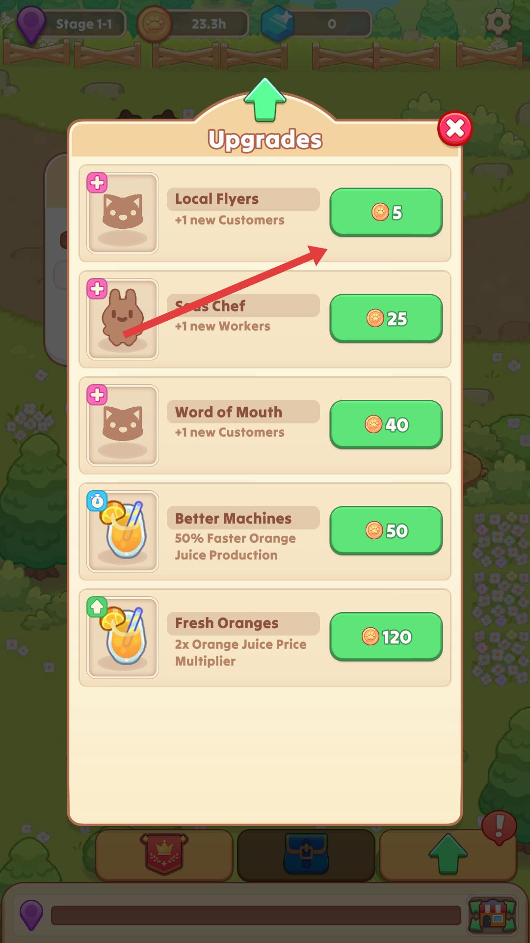 2、积累一定金币后,进入升级界面,花费金币对本地传单、更好的机器等不同项目进行升级,以此提升顾客数量、生产速度等。
