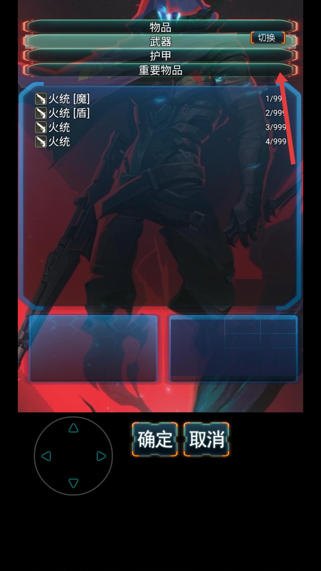 4、在物品界面可切换查看物品、武器、护甲、重要物品等分类,挑选合适的装备或物品,为角色进行配备,提升角色能力。