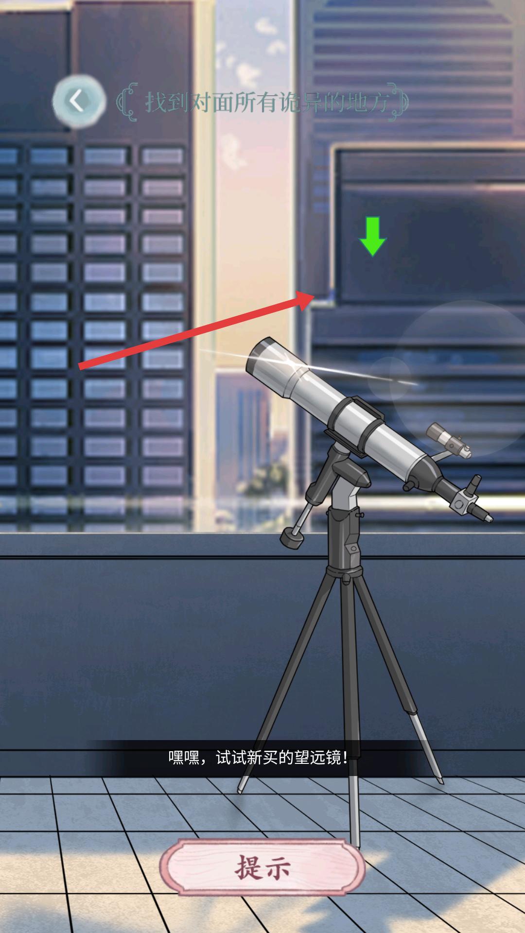 2、在场景中找到望远镜,点击使用望远镜,调整视角,观察对面建筑的情况,寻找诡异之处。