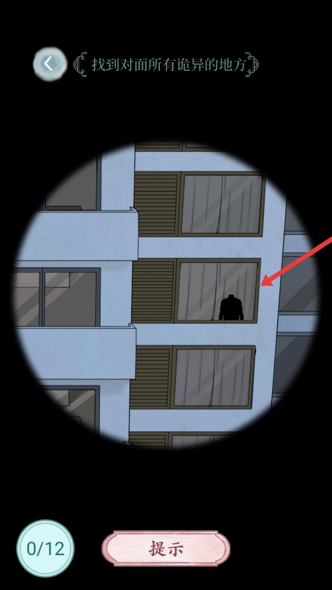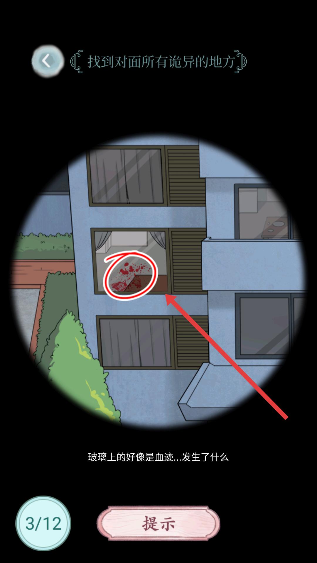 4、持续用望远镜扫描对面建筑,留意玻璃上的血迹等更明显的诡异痕迹,逐一找出所有诡异的地方,完成关卡任务。
