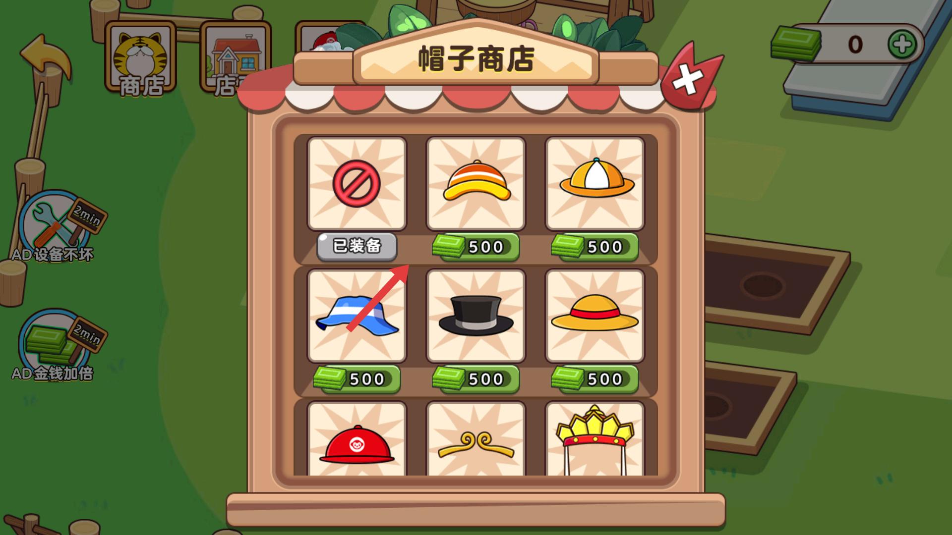 4、在商店中购买帽子等道具,装备后可提升角色的属性或外观,同时继续经营店面,获取更多收益以解锁更多道具和内容。