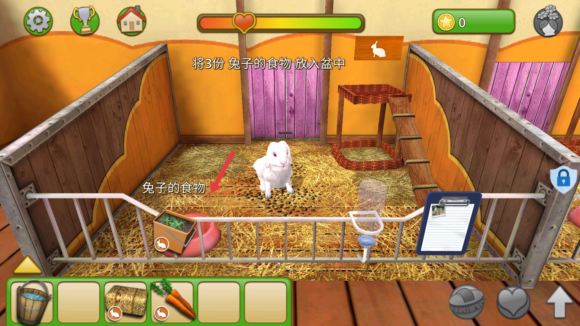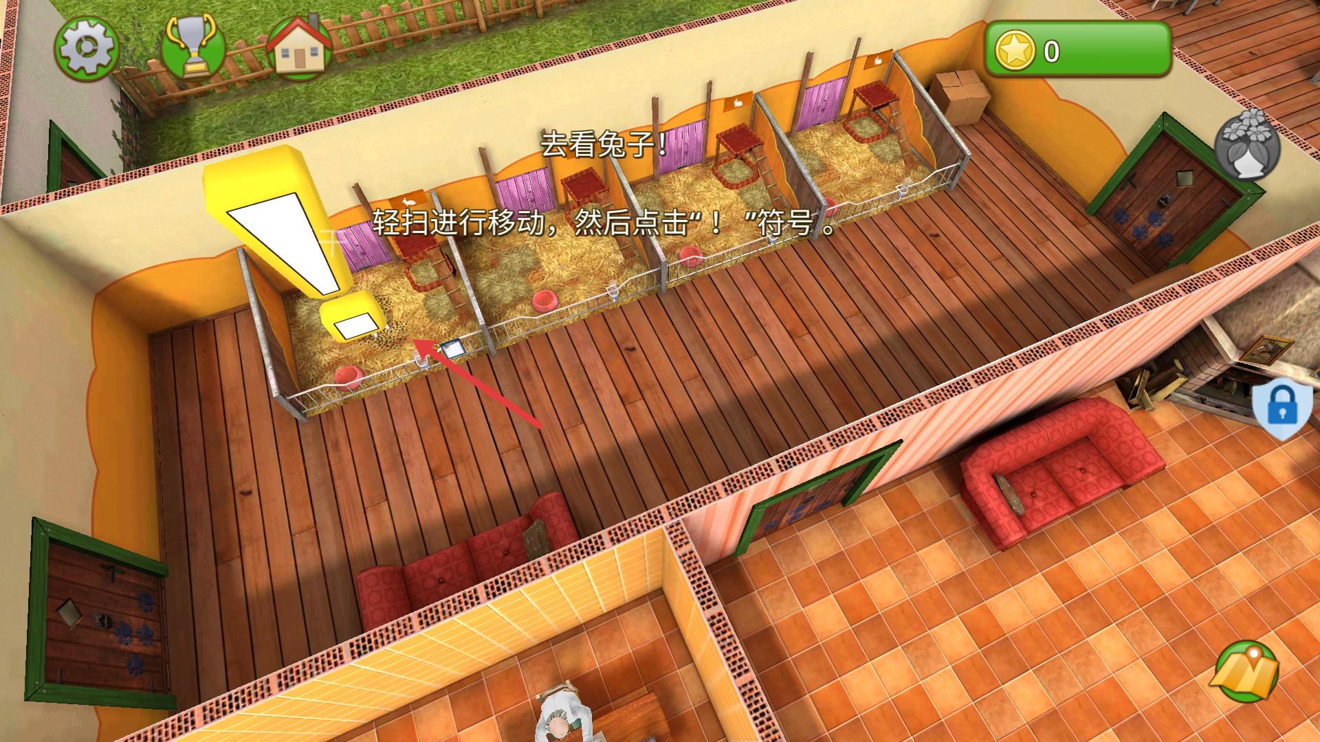 1、轻扫屏幕移动视角,找到带有提示符号的兔笼,点击进入,开启兔子的护理任务。