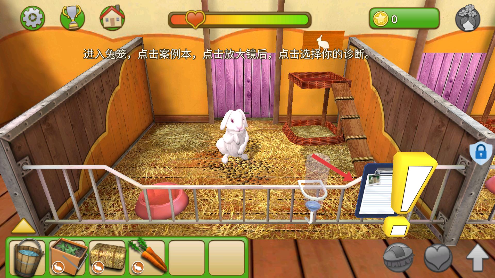 2、进入兔笼后,点击案例本,再点击放大镜,根据提示选择合适的诊断,了解兔子的状况。