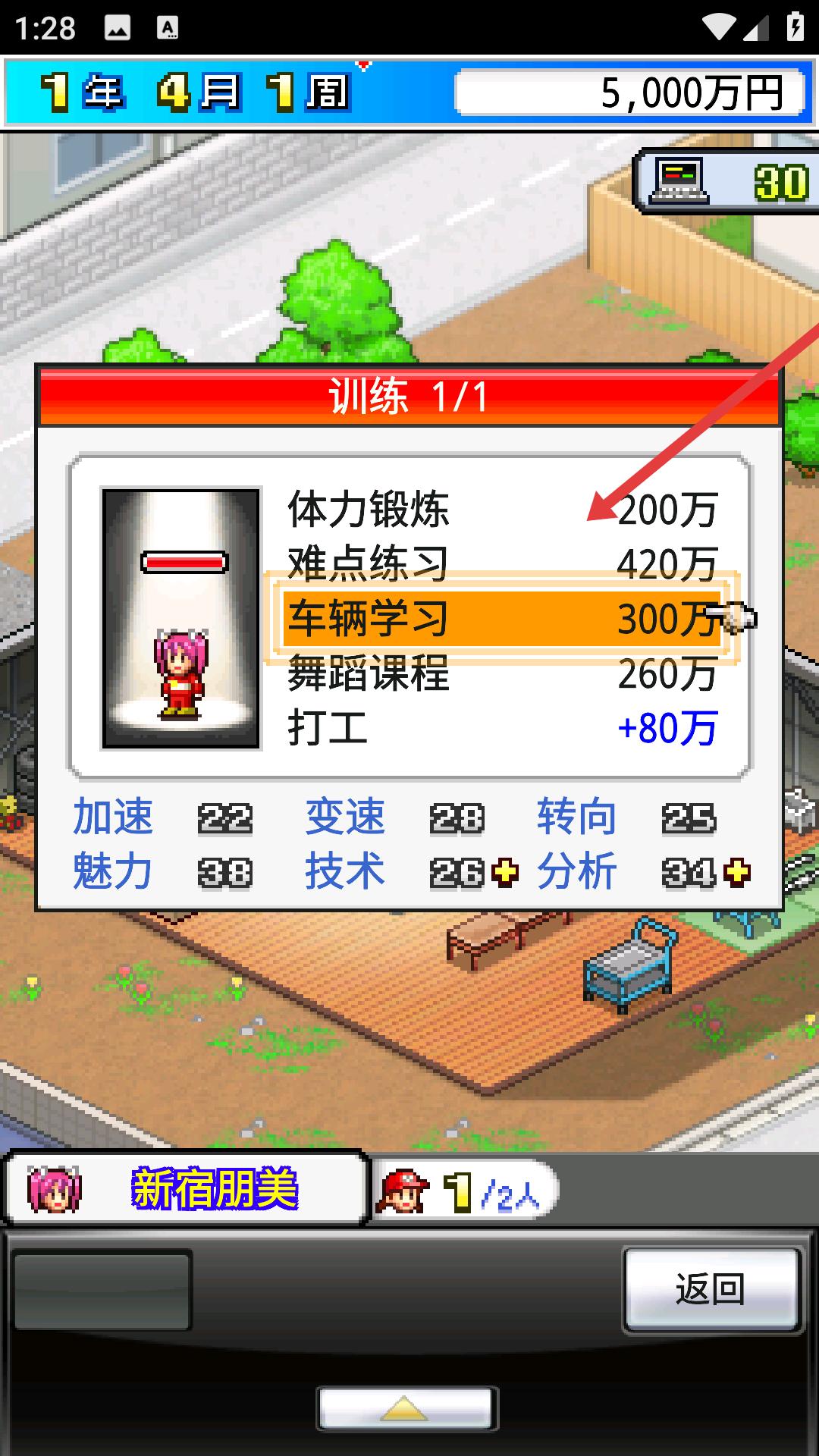 3、在训练项目列表中选择合适的训练内容,如车辆学习等,消耗资金以提升成员的赛车技能。