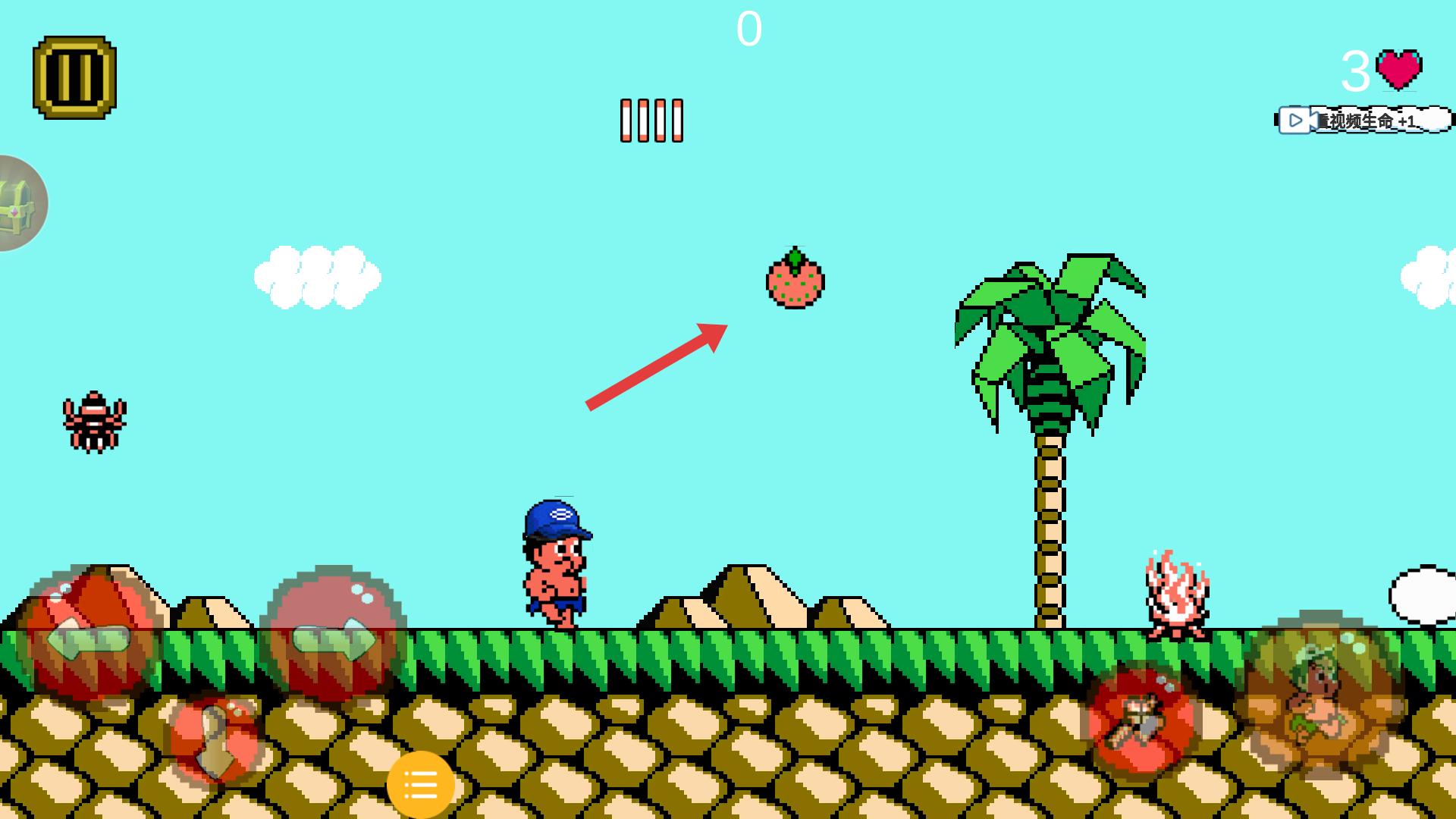2、操控角色在场景中移动,躲避敌人和障碍物,同时收集空中的水果等物品,获取分数和资源。