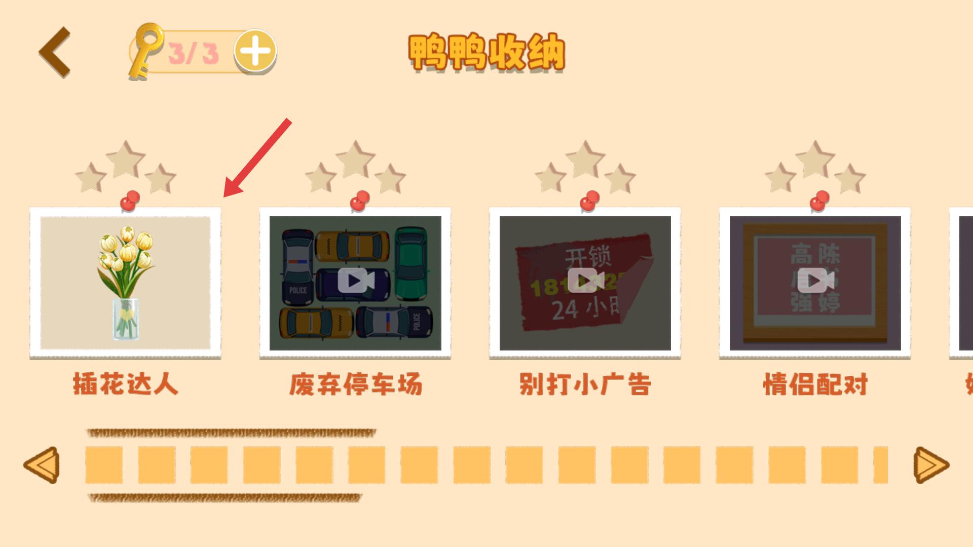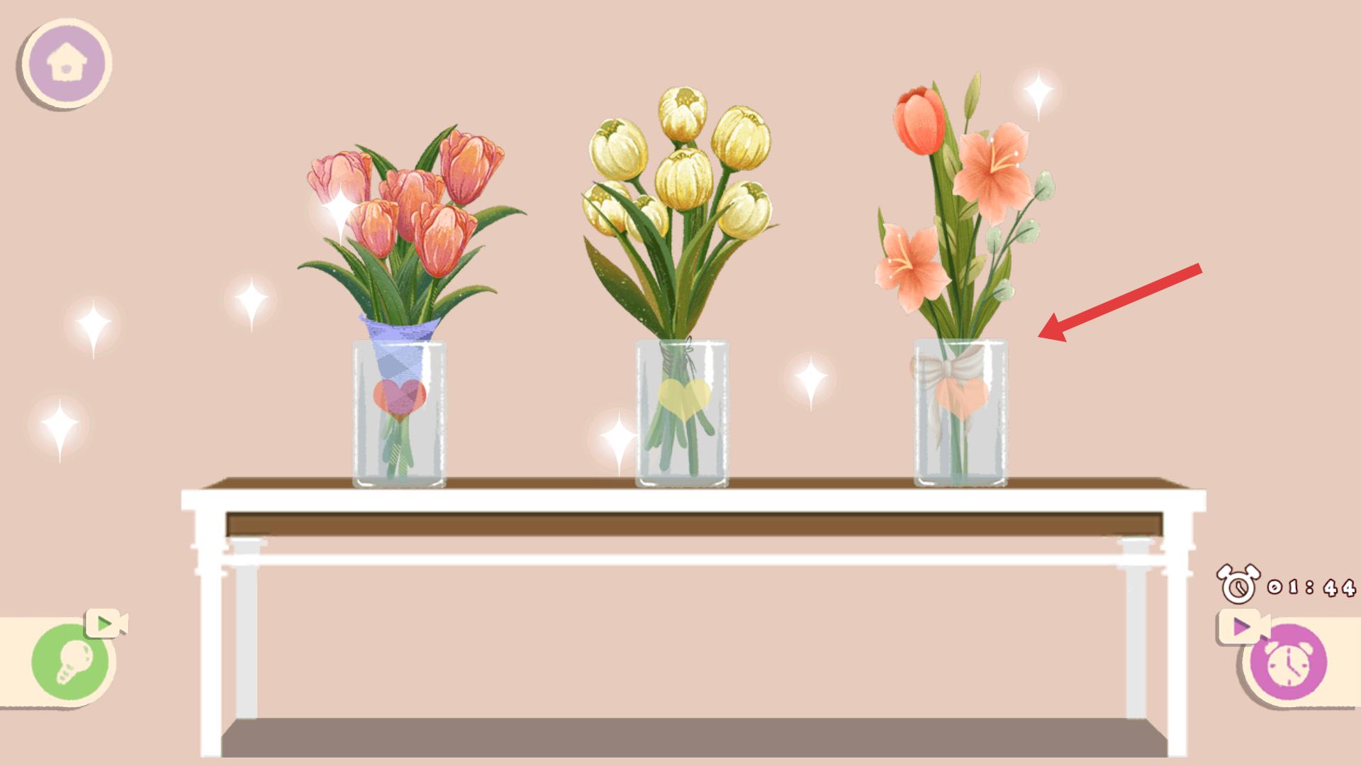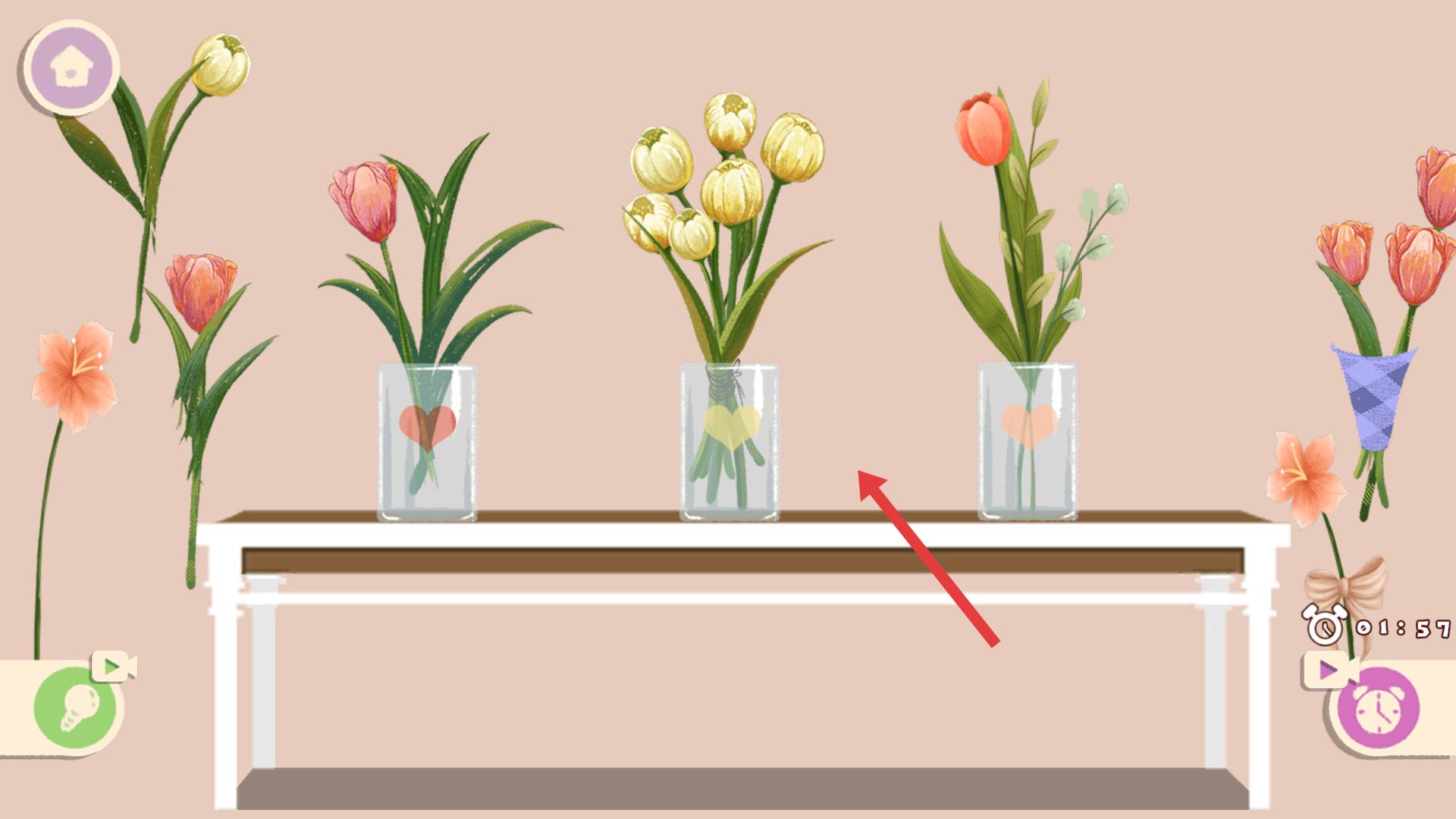 1、选择游戏关卡,如插花达人,进入对应的游戏场景,准备进行收纳操作。