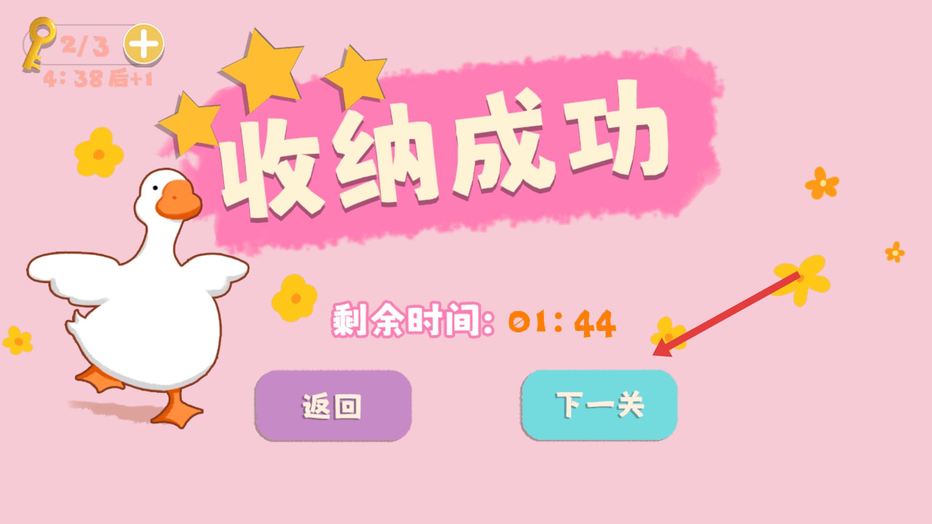 4、收纳成功后,可选择进入下一关继续挑战,或返回主界面选择其他关卡游玩。