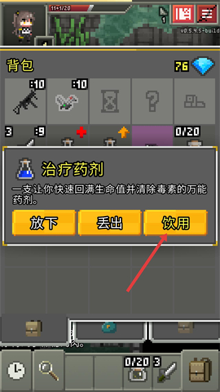4、打开背包,选择治疗药剂并点击饮用,快速恢复生命值,以便继续在地牢中探索。