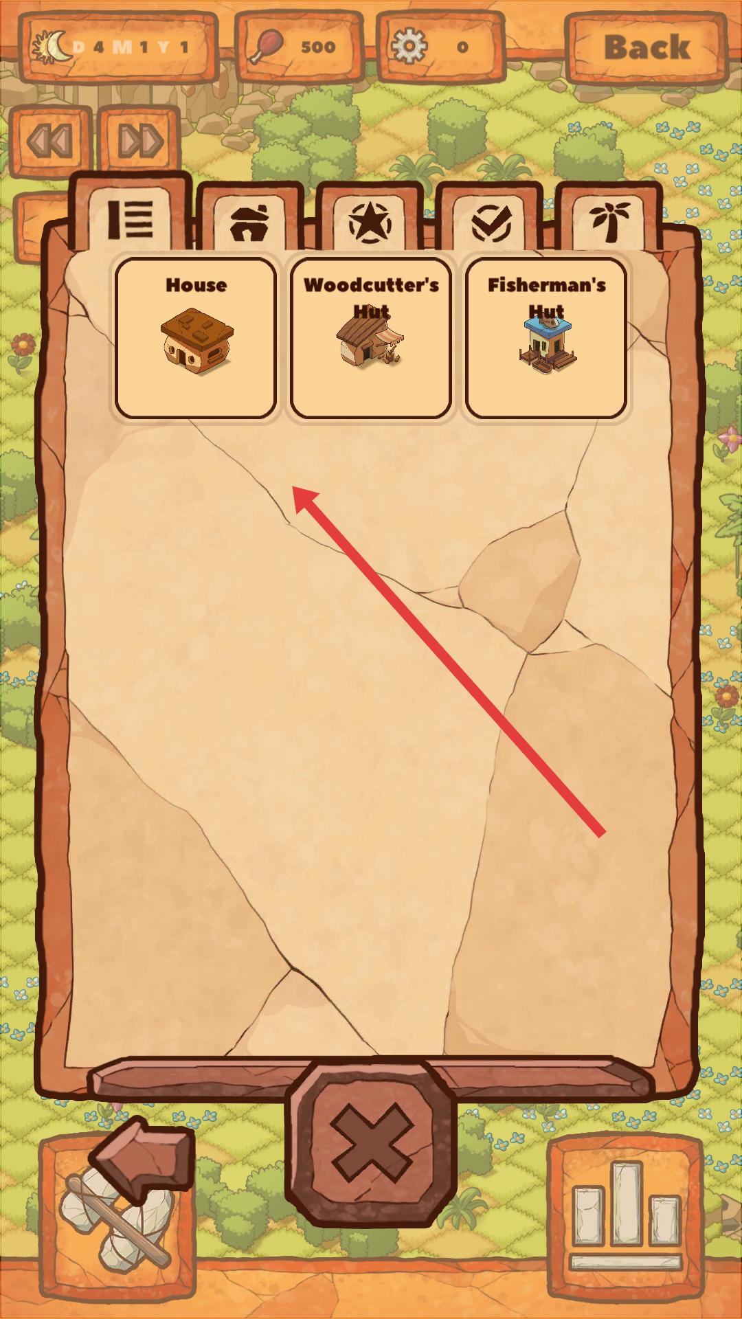 2、进入游戏后可在建筑界面选择建造房屋、樵夫小屋、渔夫小屋等不同建筑,不同建筑有不同功能助力发展。