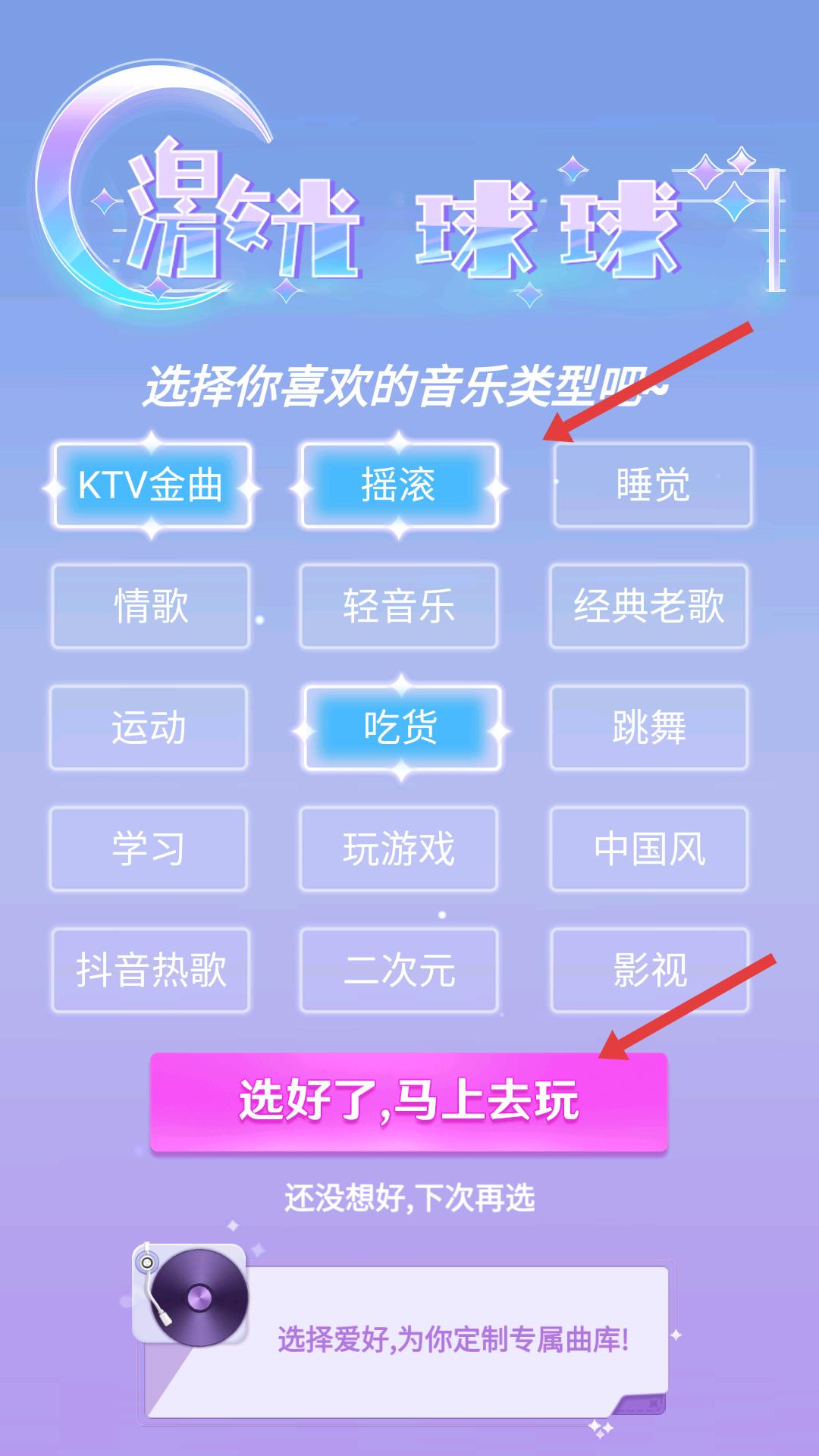 1、进入游戏,在音乐类型选择界面勾选喜好类型,点击下方粉色按钮,进入包含各类歌曲的选择页面。