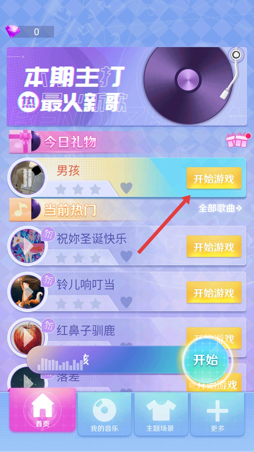 2、在歌曲列表挑选想玩的曲目,点击右侧开始游戏按钮,进入小球沿彩色方块路径滚动的游戏界面。