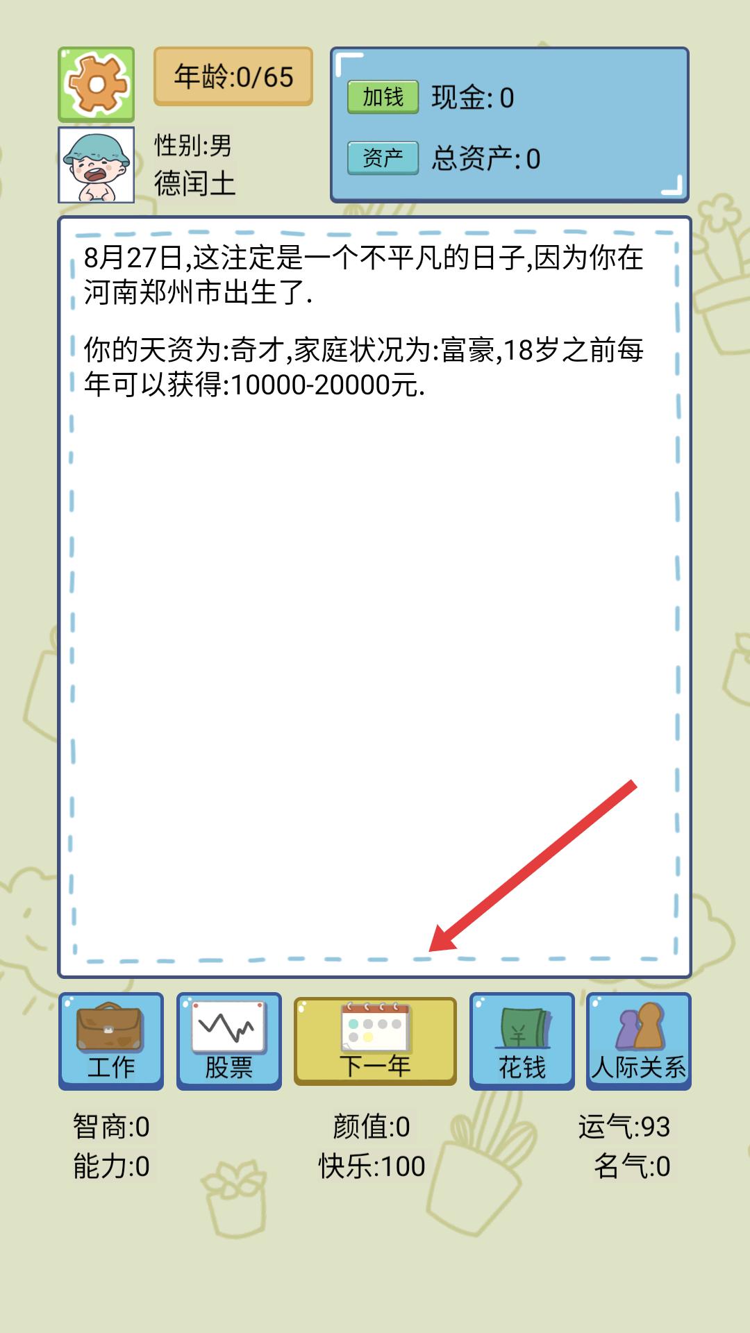 1、进入游戏后,能看到自身初始信息,点击下一年,可推进游戏进程,开启后续不同阶段的人生事件与选择。
