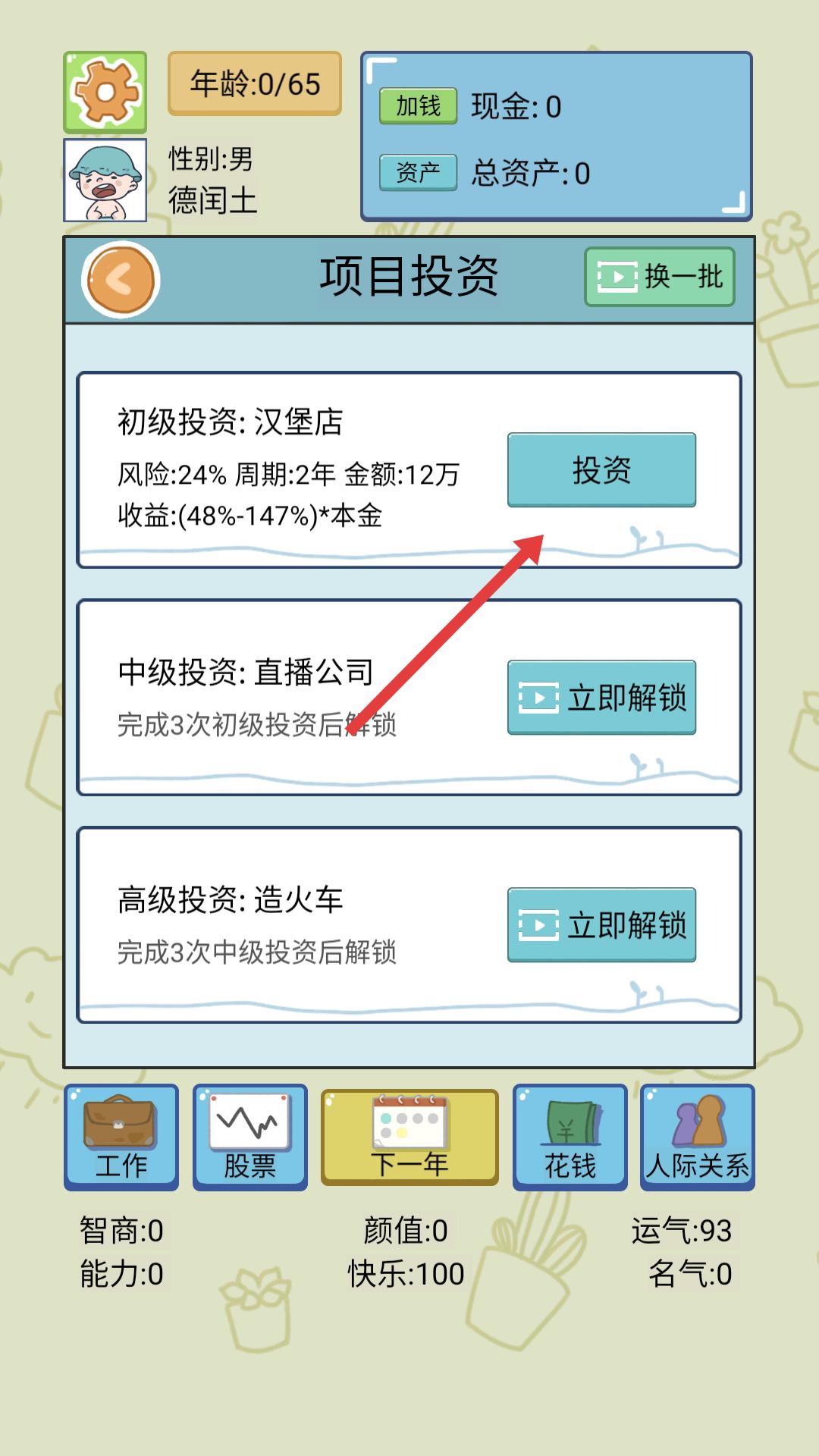 2、若有资金且符合条件,可进行项目投资,比如选择初级投资的汉堡店,投入资金后,经过对应周期,有望获得收益,不过投资存在风险。