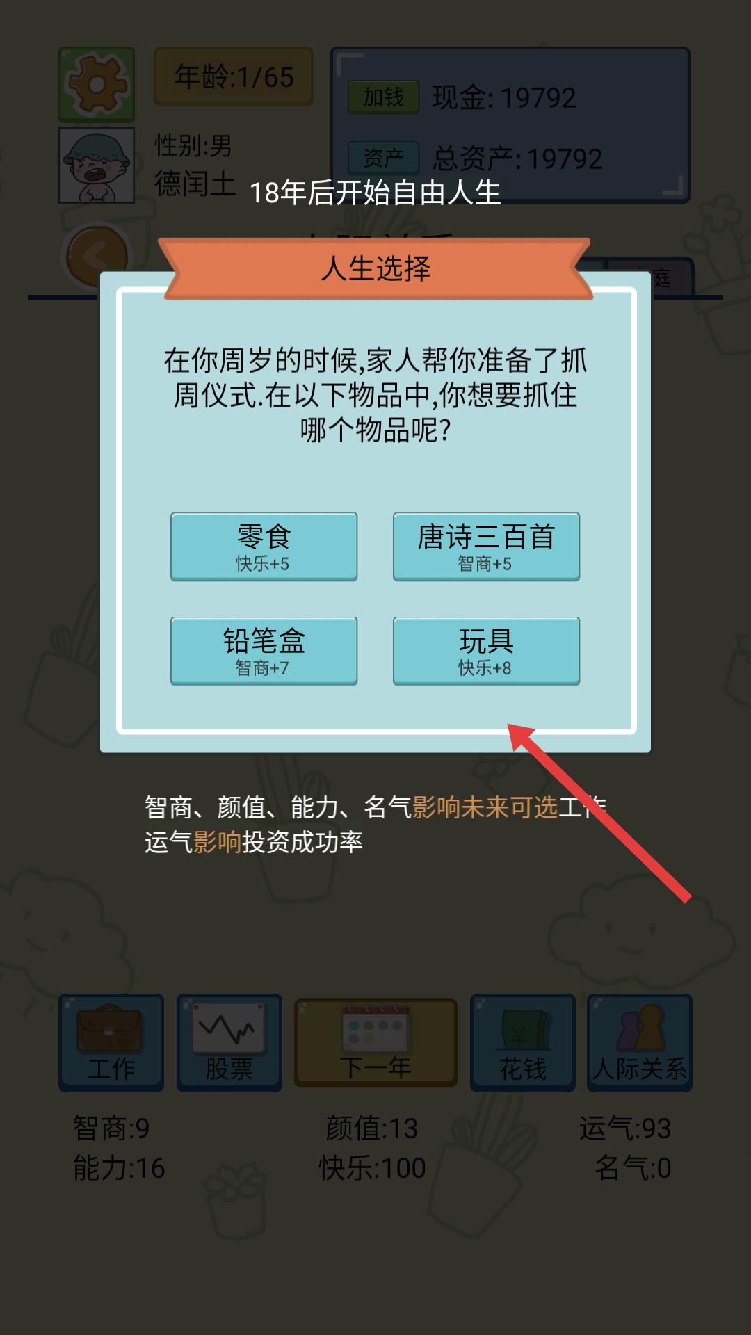 4、当遇到人生选择类事件,比如抓周仪式时,从给出的物品中挑选一个,不同物品会带来不同属性的提升,进而影响后续的人生走向。