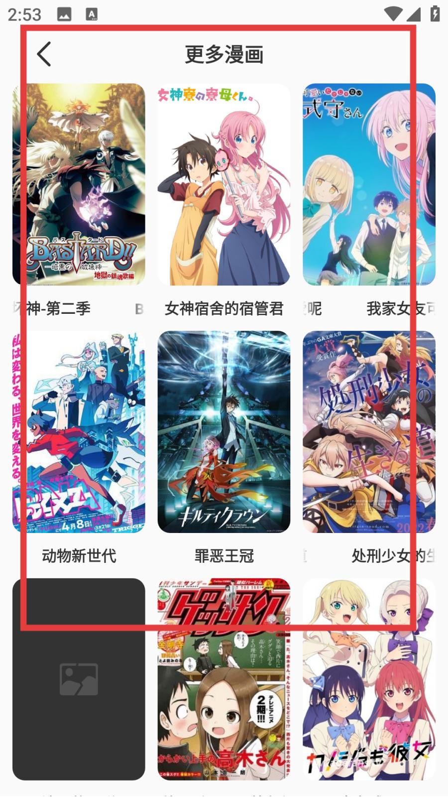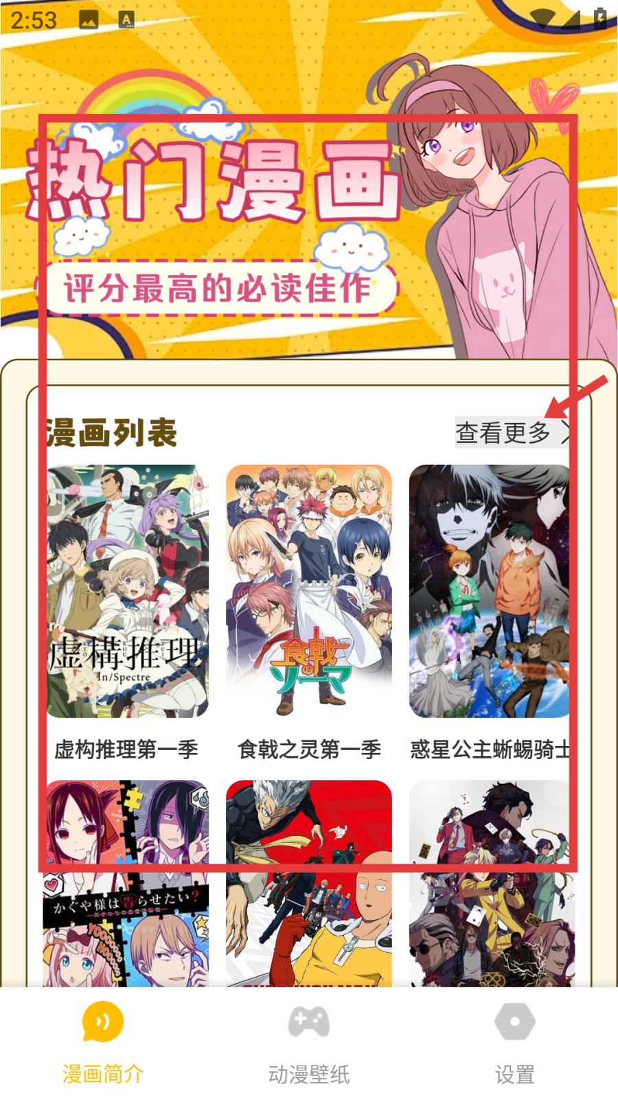 1、打开心动二次元进入软件主界面,界面有热门漫画板块,还有查看更多按钮,点击查看更多按钮,进入更多漫画列表页面。