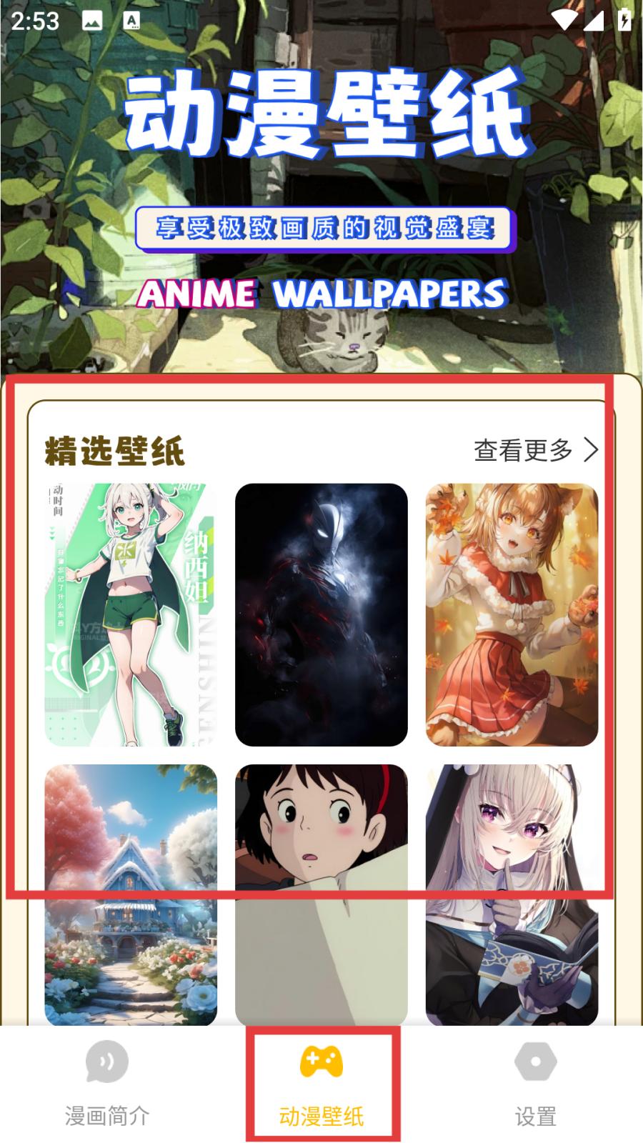 4、返回软件主界面后,界面底部有漫画简介、动漫壁纸、设置选项,点击动漫壁纸选项,进入动漫壁纸页面,页面有精选壁纸板块,展示多张动漫壁纸。