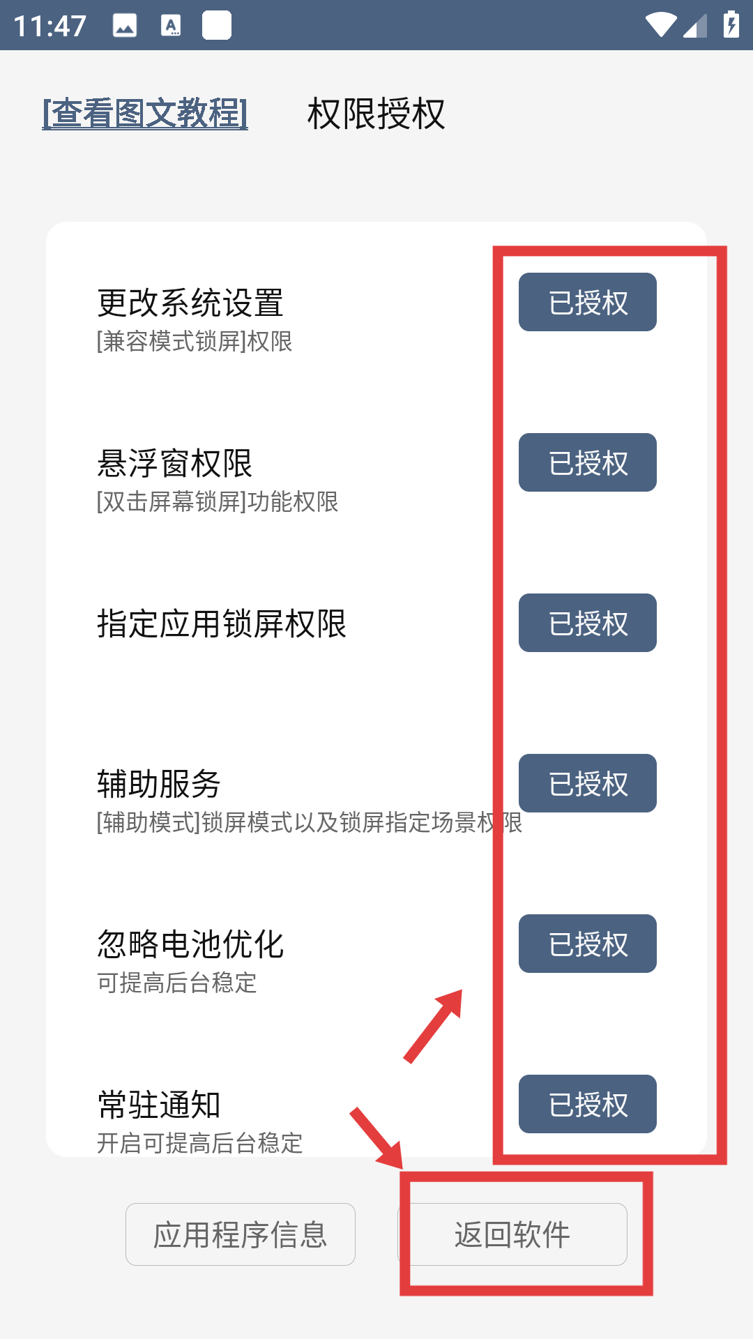4、完成所有权限设置后,返回权限授权页面,查看各项权限状态,确认多项权限均已显示为已授权,点击页面底部的返回软件按钮,回到软件主界面。