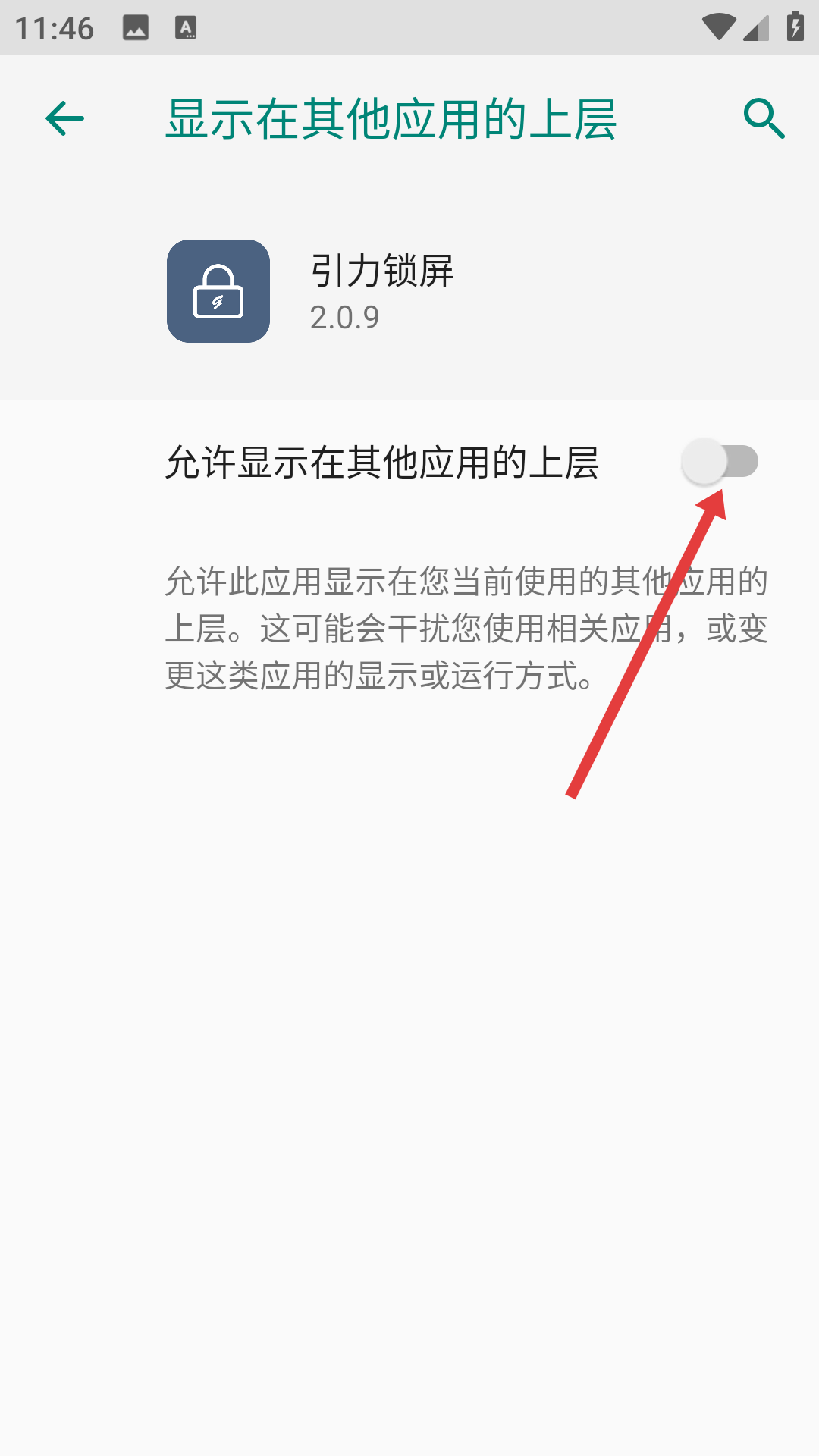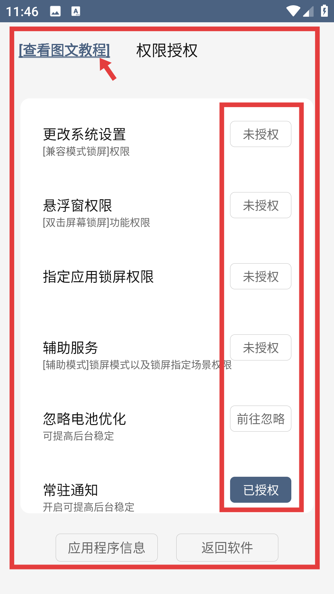 1、打开引力锁屏的权限授权相关页面,页面显示更改系统设置、悬浮窗权限等多项权限,且大多处于未授权状态,点击页面上的查看图文教,查看图文指导内容。