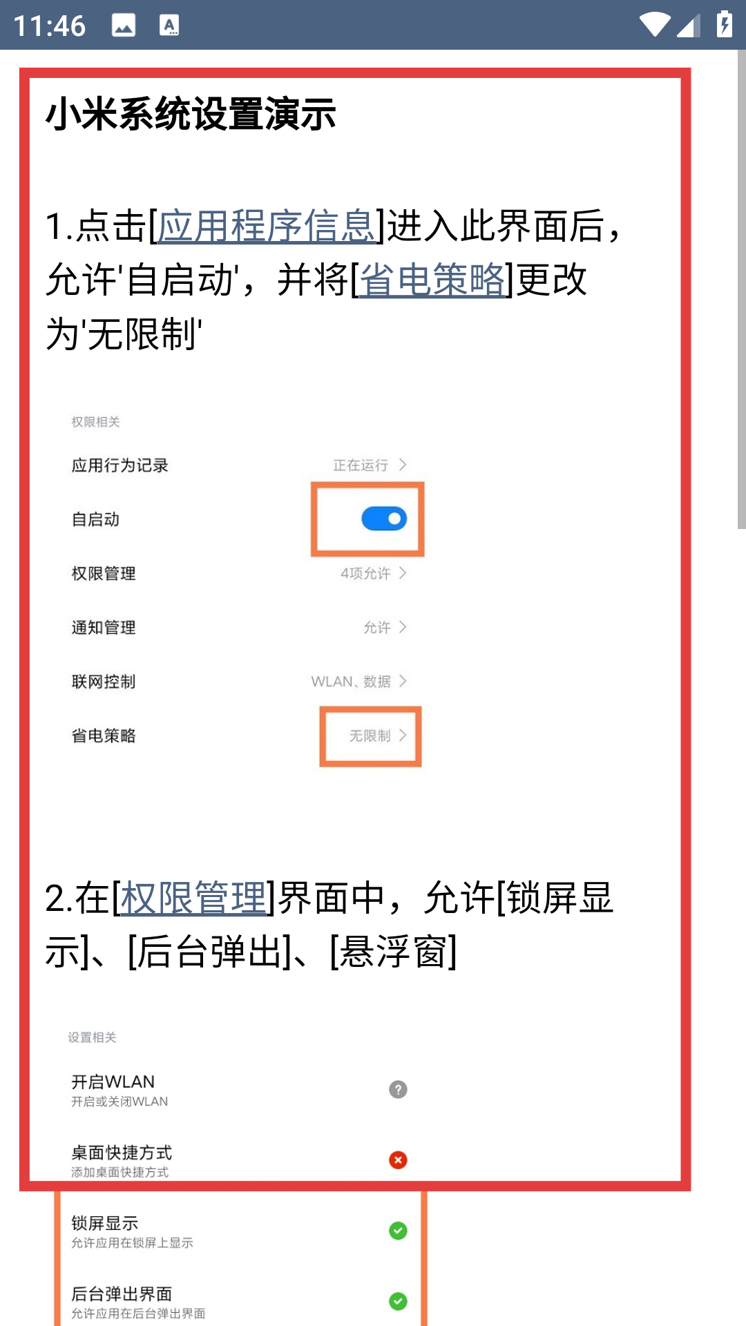 2、查看完图文教程后,按照教程指引将自启动开启,并把省电策略更改为无限制。