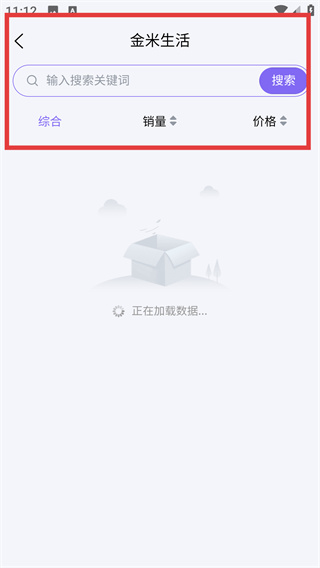 4、进入搜索页面后,页面有输入框和搜索按钮,还有综合、销量等排序选项,在输入框中输入想要搜索的商品关键词,点击搜索按钮,即可搜索出相关商品。