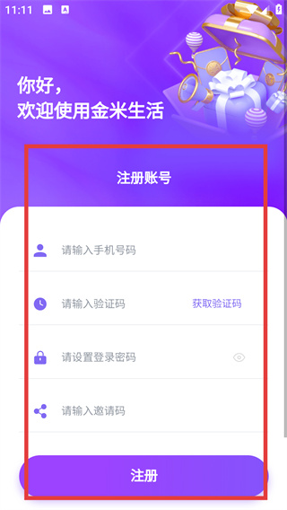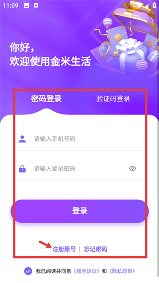 1、打开金米生活进入登录页面,页面有密码登录和验证码登录两种登录方式,还有注册账号、忘记密码选项以及协议政策勾选框,点击注册账号选项,进入注册账号页面。