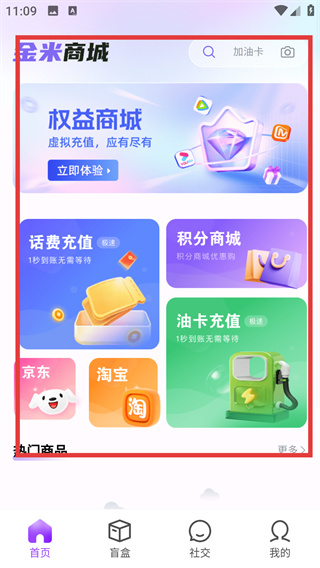 3、注册成功后进入金米商城页面,页面有搜索框,还有权益商城、话费充值等功能入口,以及京东、淘宝等平台入口,点击页面中的搜索框,进入搜索页面。