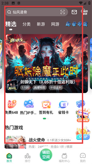 1、打开一折手游进入首页,首页有搜索框,还有精选、分类、新游等标签,以及推荐的游戏和功能入口,点击页面顶部的搜索框,进入搜索页面。