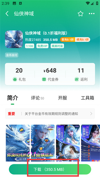 4、进入游戏详情页面后,页面展示了游戏的热度、大小等信息,还有礼包、代金券等板块,以及简介、评论等标签,点击页面底部的下载按钮,即可开始下载该游戏。