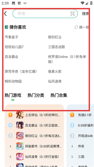 2、进入搜索页面后,页面有猜你喜欢板块,还有热门游戏、热门分类等标签,在搜索框中输入想要查找的游戏类型,点击搜索框右侧的搜索按钮,展示出相关游戏。