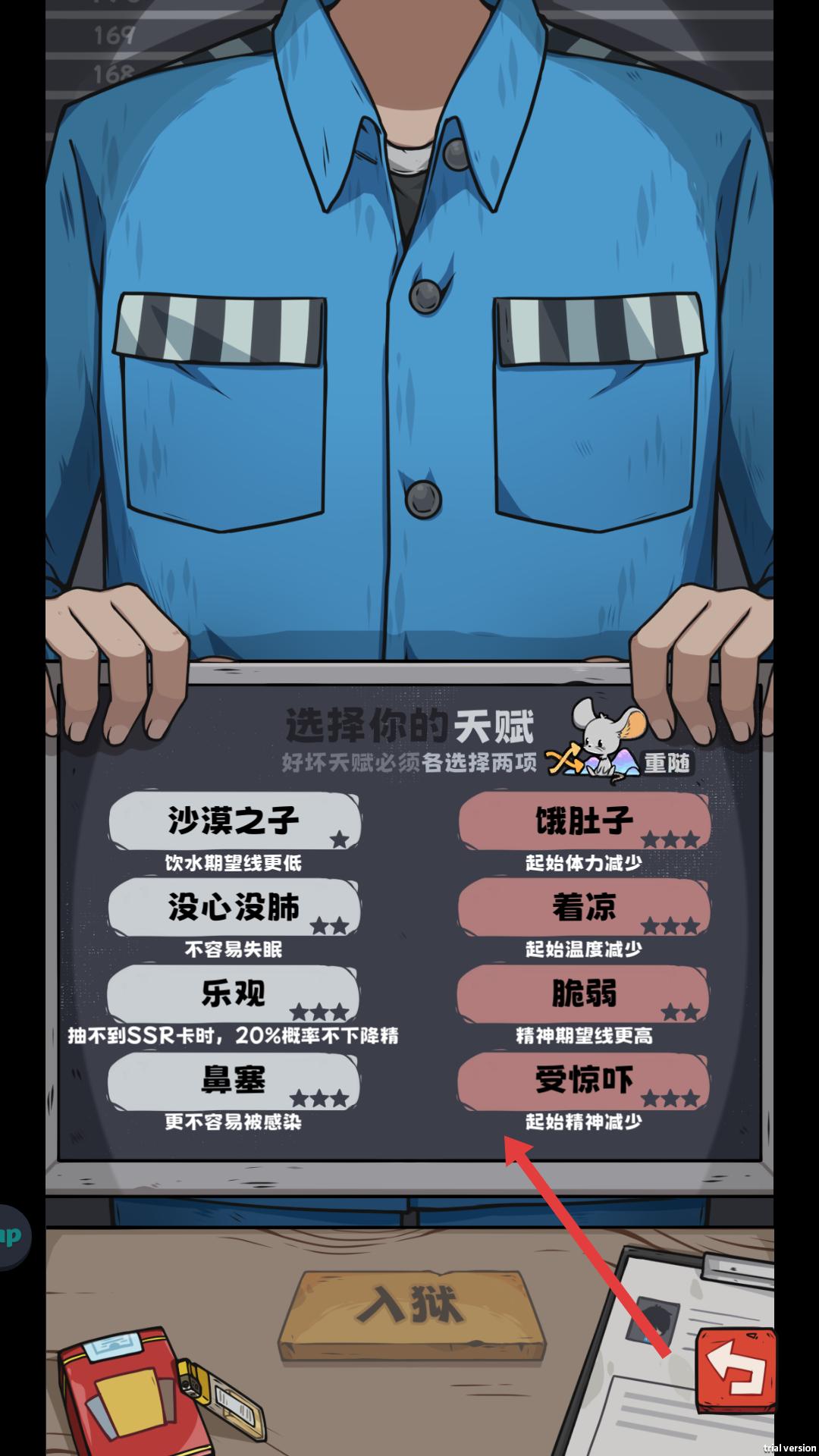 1、在天赋选择界面,按照要求挑选两项好天赋和两项坏天赋,选好后开启狱中生存之旅。