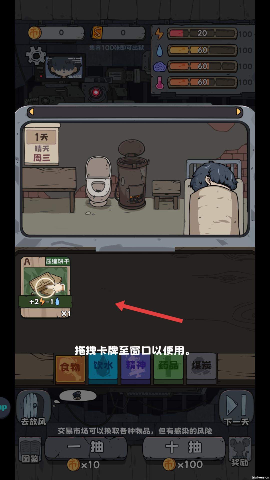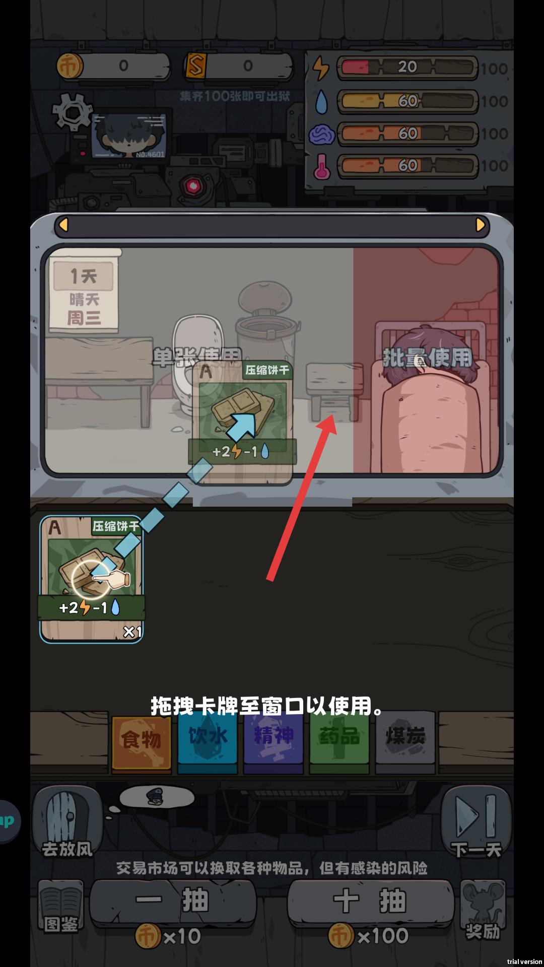 2、可通过抽取卡牌获取压缩饼干等物品卡牌,当需要补充体力等时,将卡牌拖拽到窗口使用。