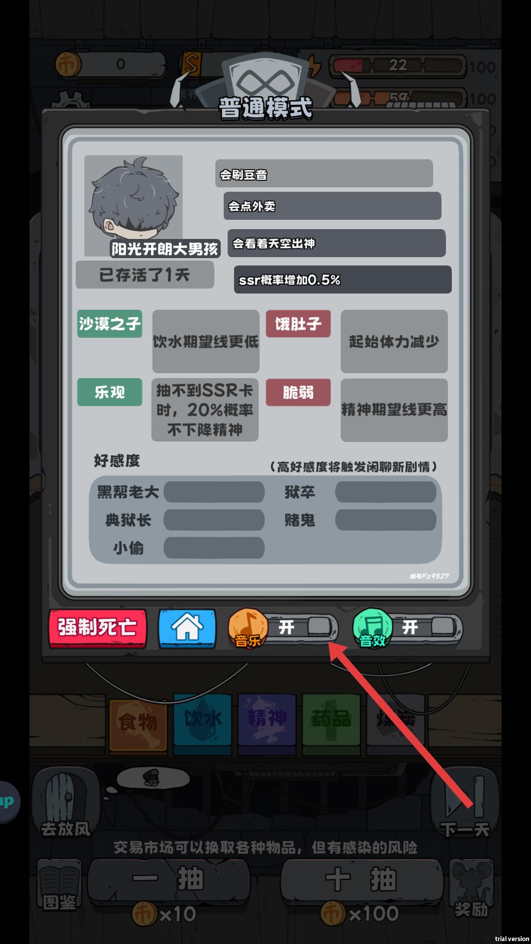 4、游戏过程中可查看角色相关界面,了解已存活天数、天赋效果等信息,还能调整音乐、音效等设置。
