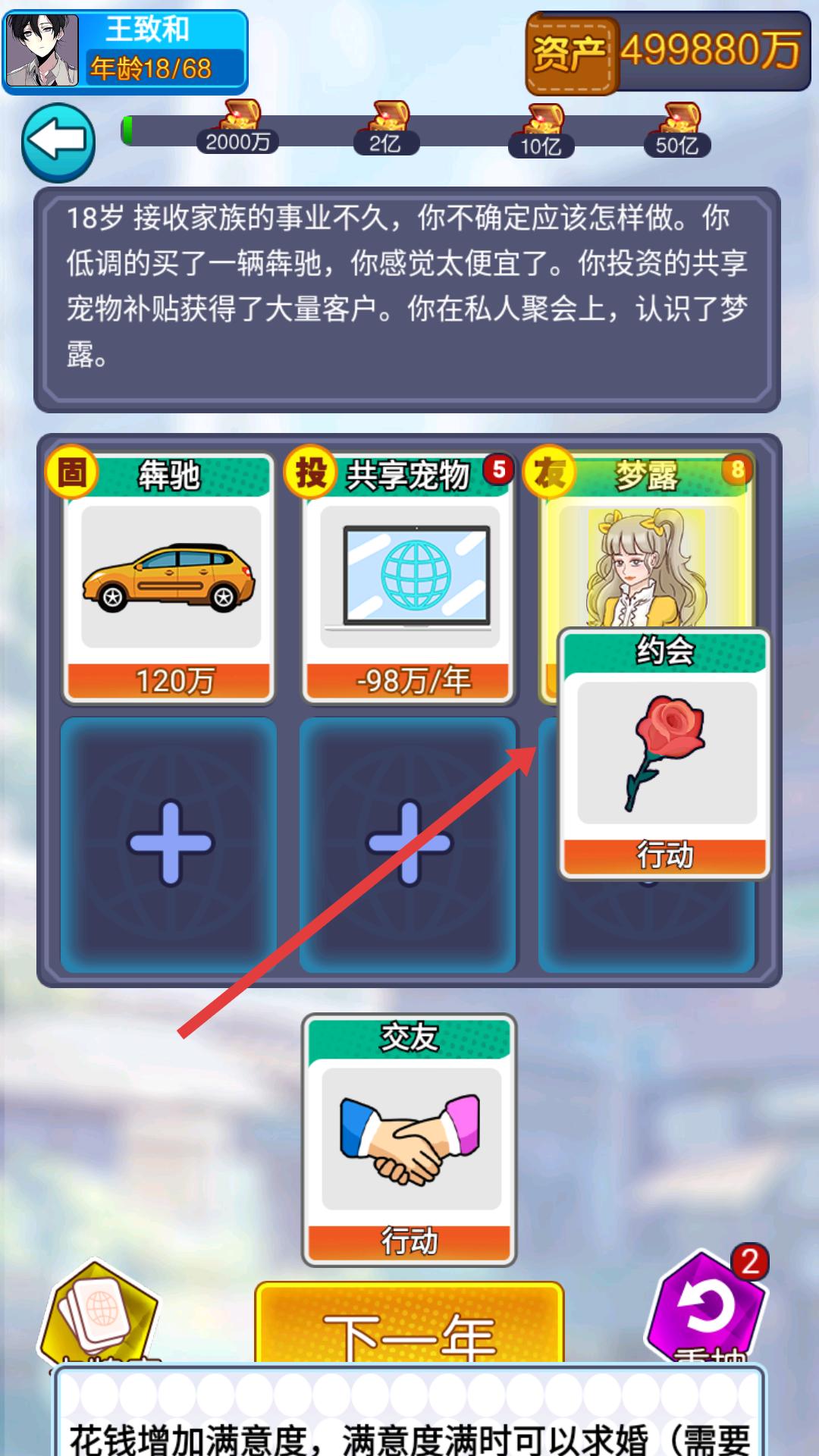 3、和人物建立关系后,使用约会等卡牌,与对方进行约会,从而提升彼此的亲密度。