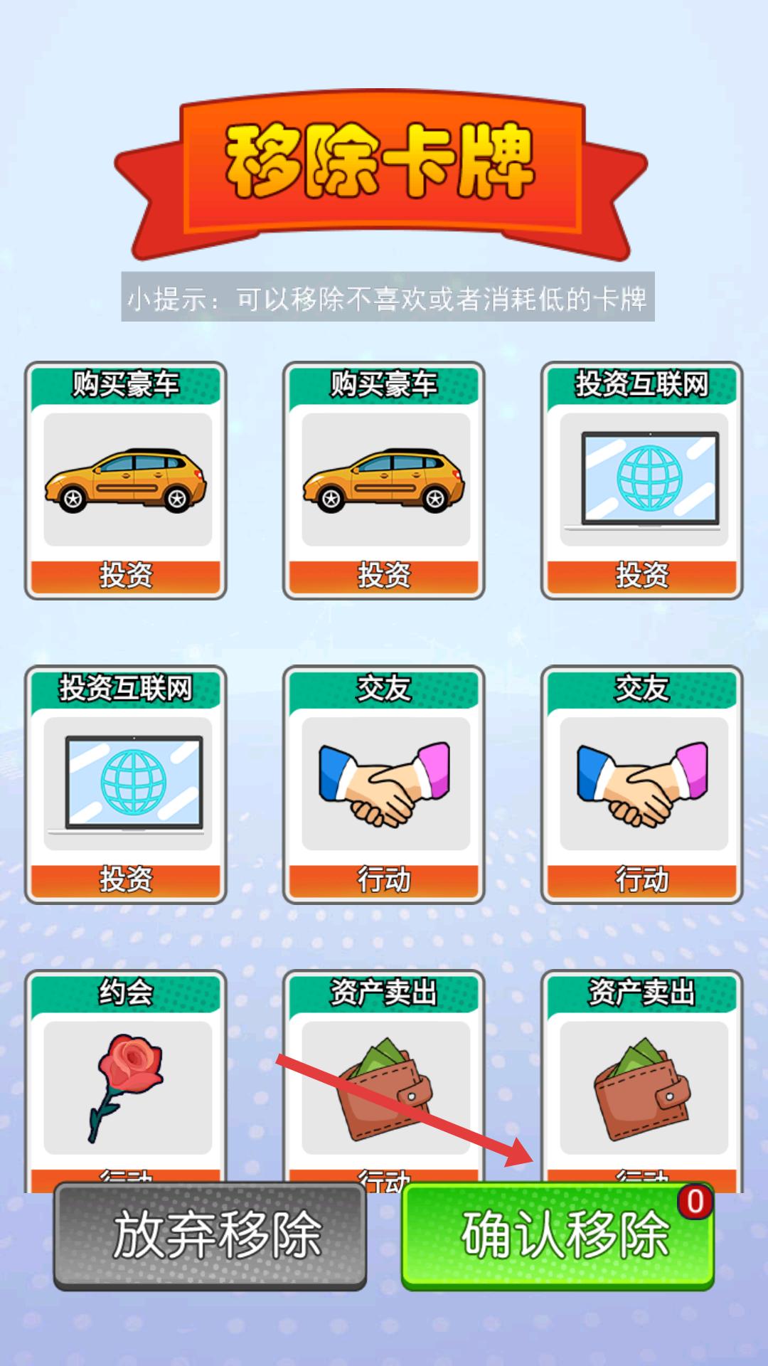 4、若有不喜欢或消耗低的卡牌,进入移除卡牌界面,选好对应卡牌,点击确认移除,管理卡牌。