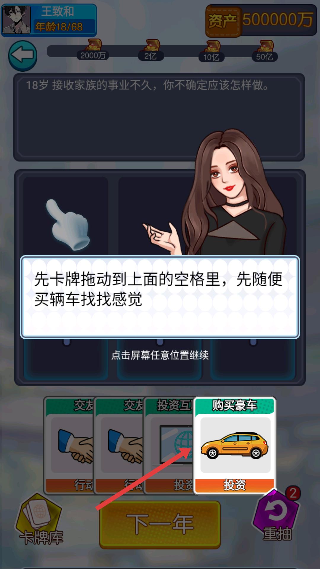 1、进入游戏后,将购买豪车等卡牌拖动到上方空格,完成购车等操作,以此熟悉游戏的基础玩法。
