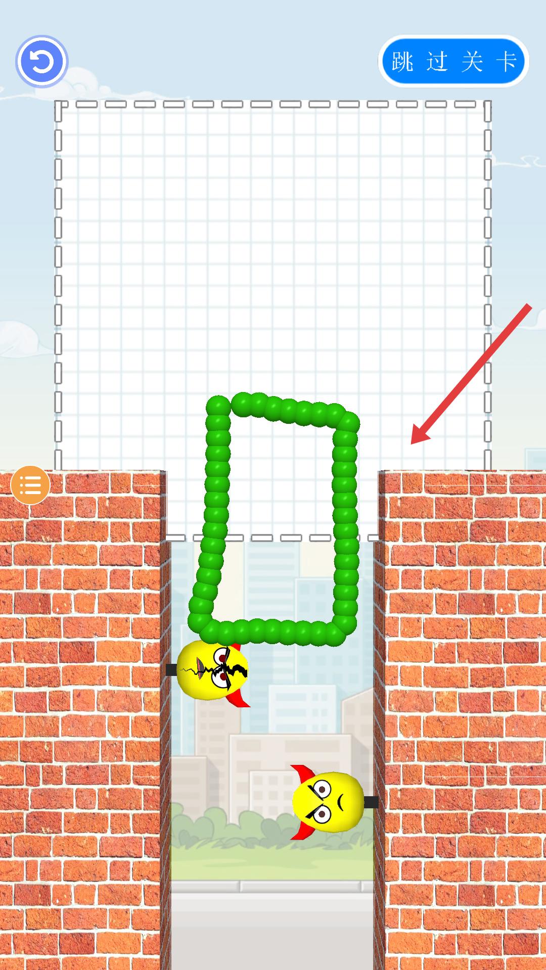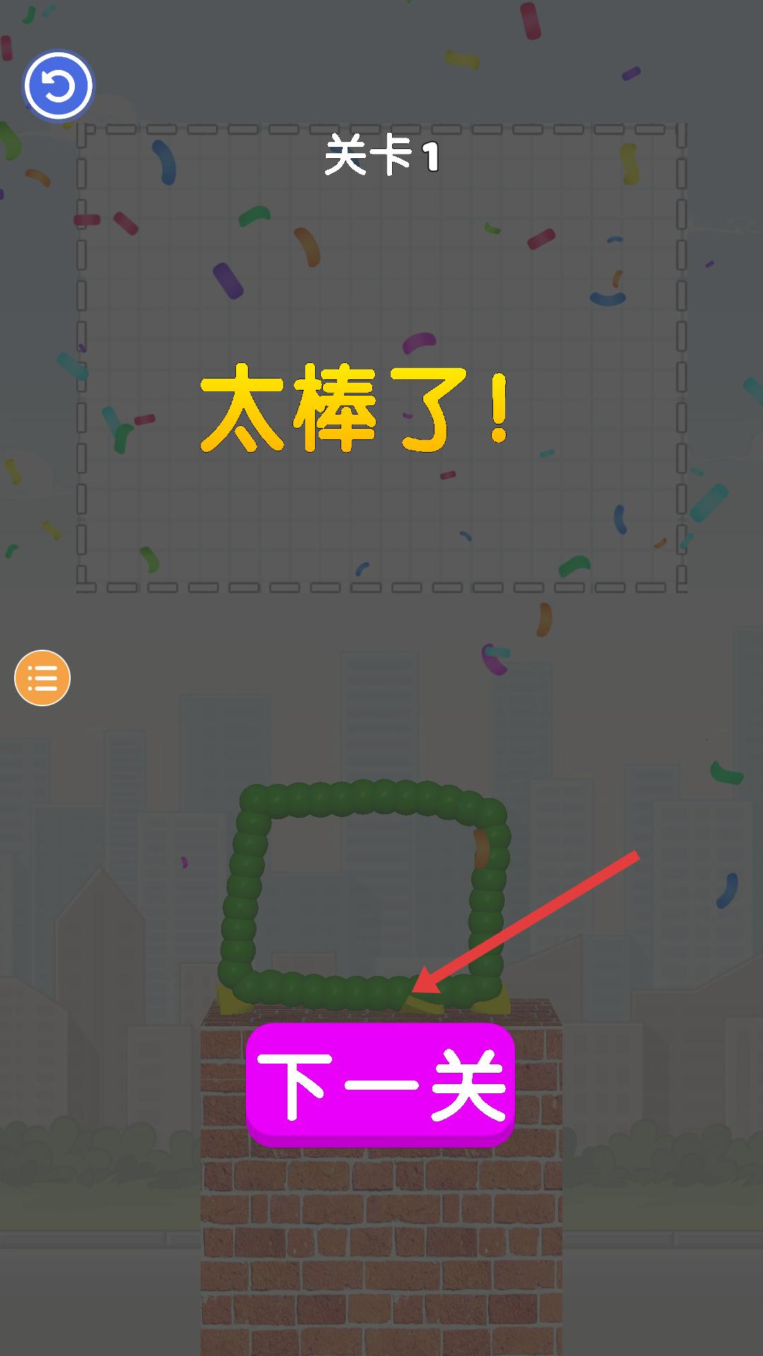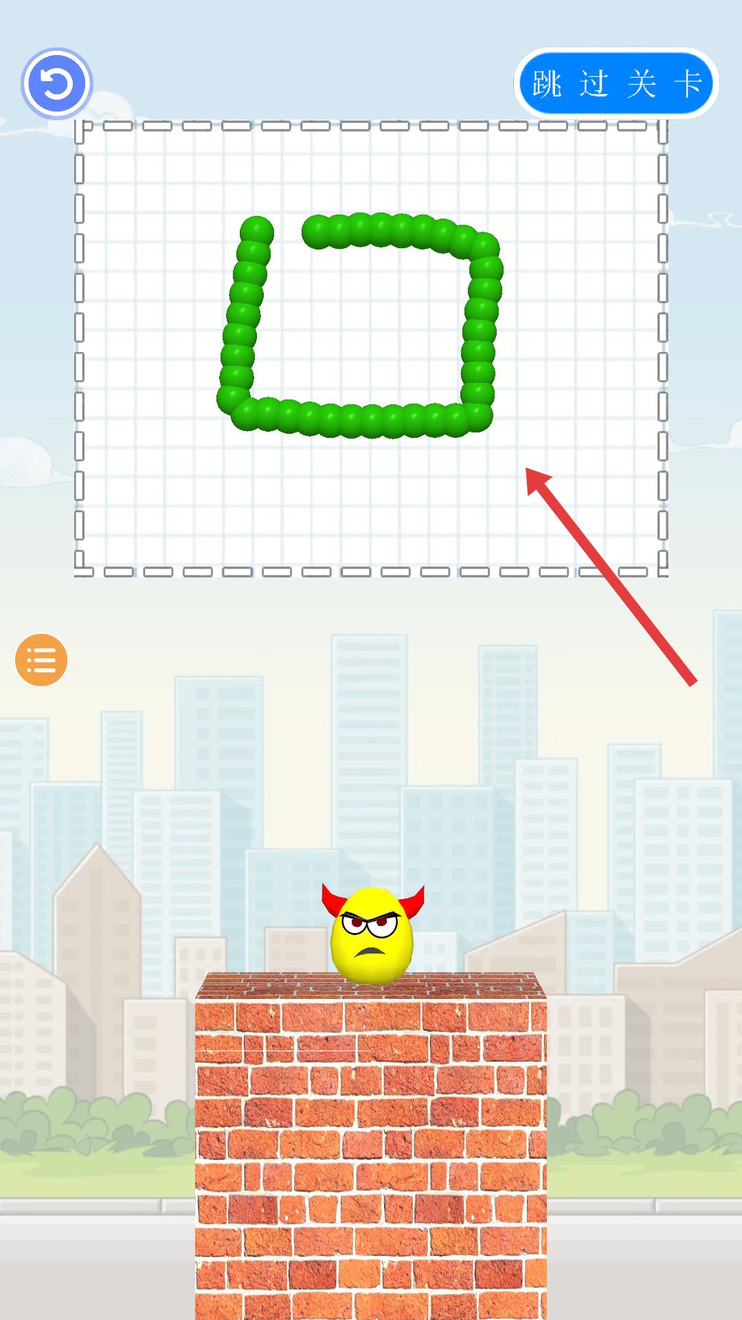 2、绘制完成后,绿色图形会下落,要是成功覆盖黄色带角角色,就能通关,通关后会出现太棒了的提示,点击下一关进入新关卡。