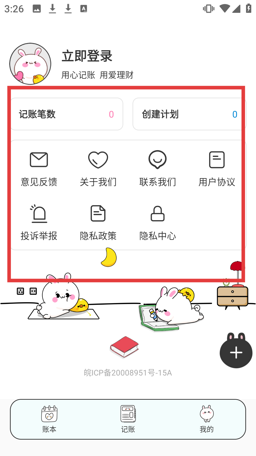 4、进入我的页面,可看记账笔数、创建计划,还有意见反馈、联系我们等功能,方便和软件互动、维护权益。