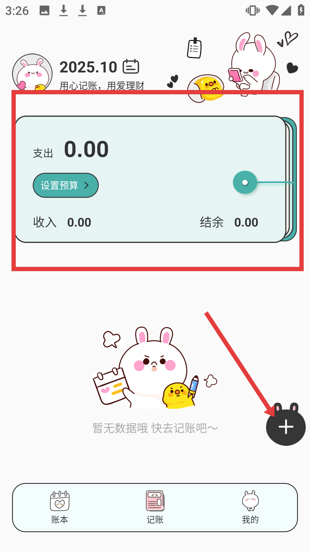 3、在记账页面能查看支出、收入和结余,用户还可设置预算,帮助把控平时消费,没数据时点击加号就能开始记账。